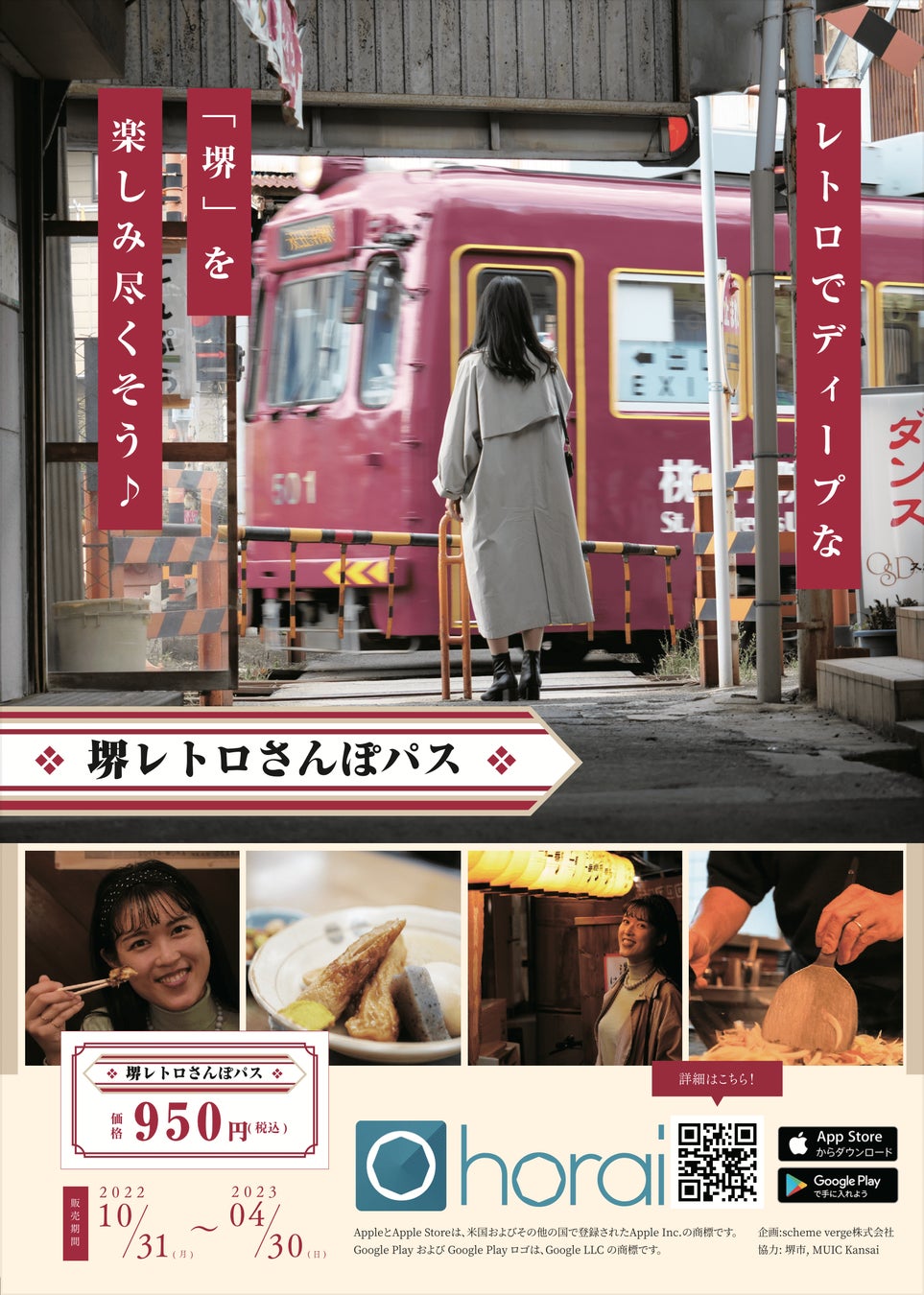 scheme verge株式会社(代表取締役 嶂南達貴、以下 scheme verge)と一般社団法人関西イノベーションセンター(代表理事 林安秀、以下 関西イノベーションセンター)は、仕事帰りや休日に堺市の魅力を楽しむ周遊パスポート「堺レトロさんぽパス」を2022年10月31日より販売開始しました。scheme vergeの提供するエリア活性化ツール「Horaiエリアマネジメント」を用いて、堺市の市街地でのデータにもとづいた持続的な賑わい創出を目指します。