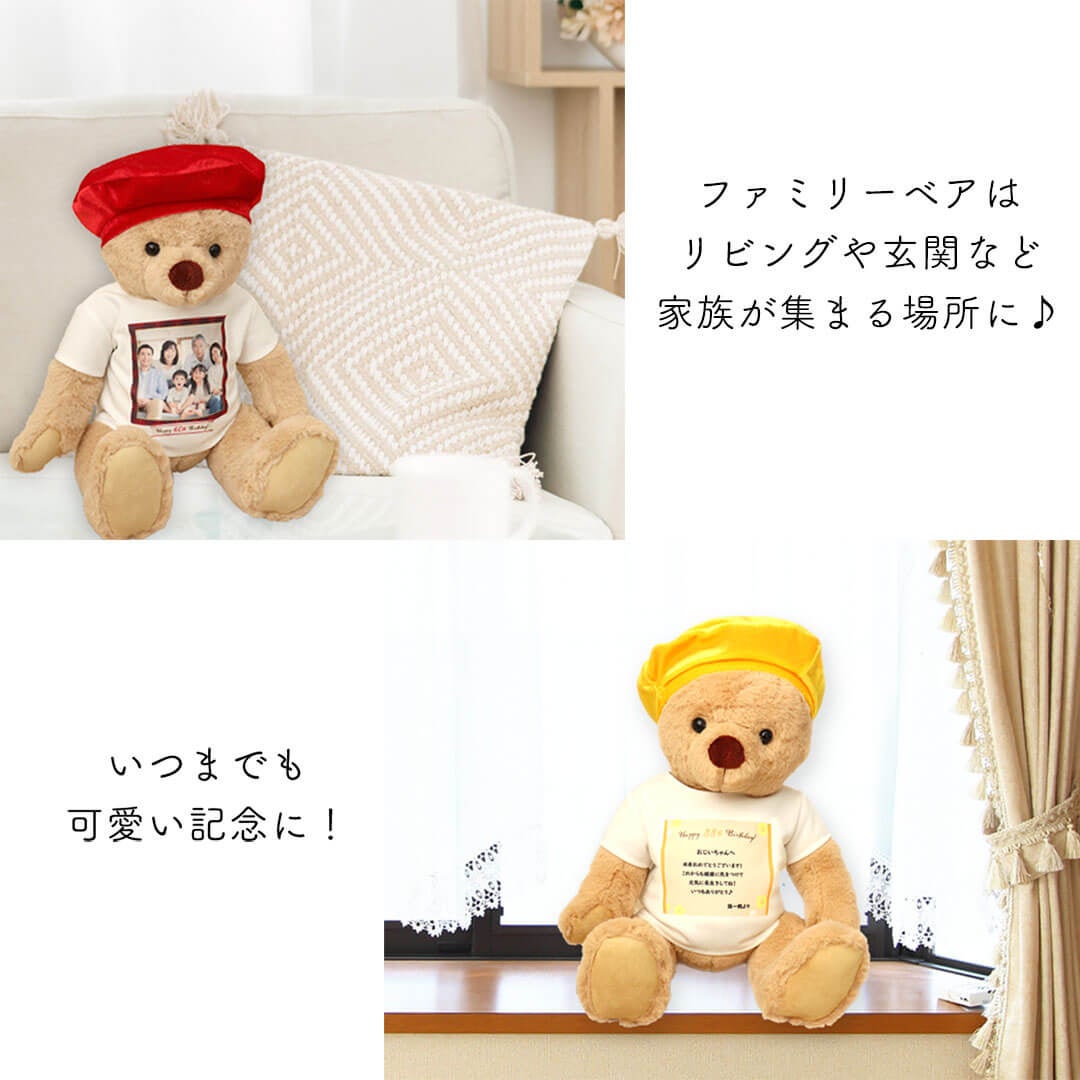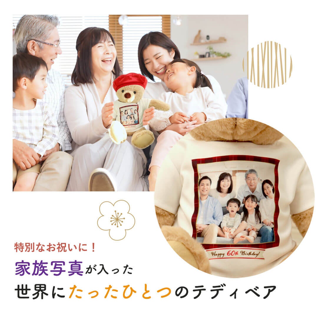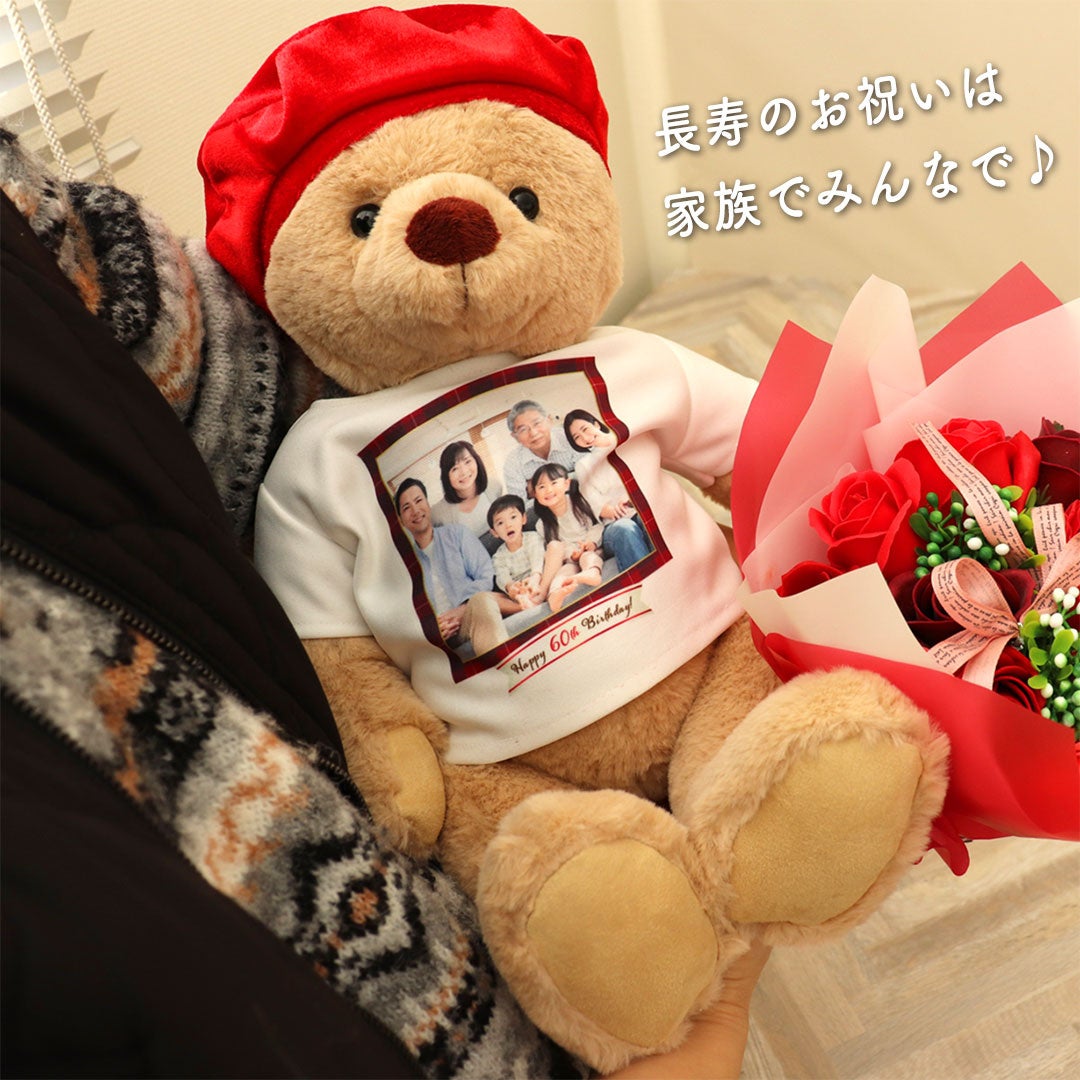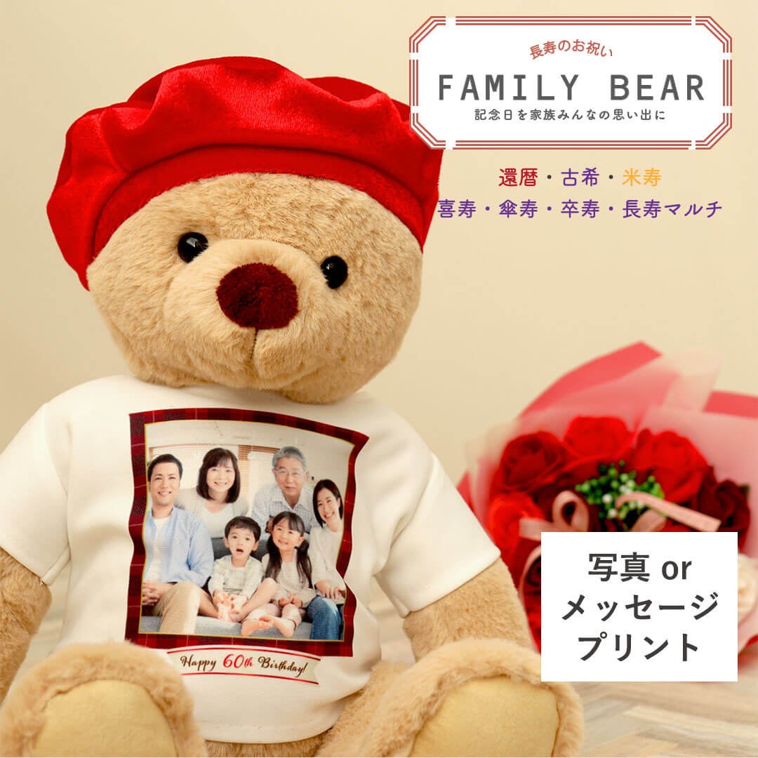 「ファミリー長寿ベア」はテディベアのTシャツに、オリジナルの写真またはメッセージをプリントした「家族の想い」がカタチになる、記念写真のようなテディベアです。
