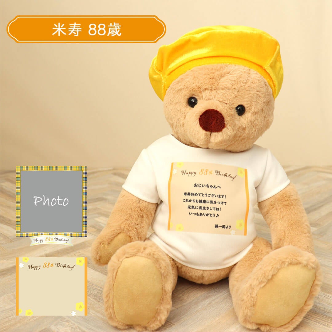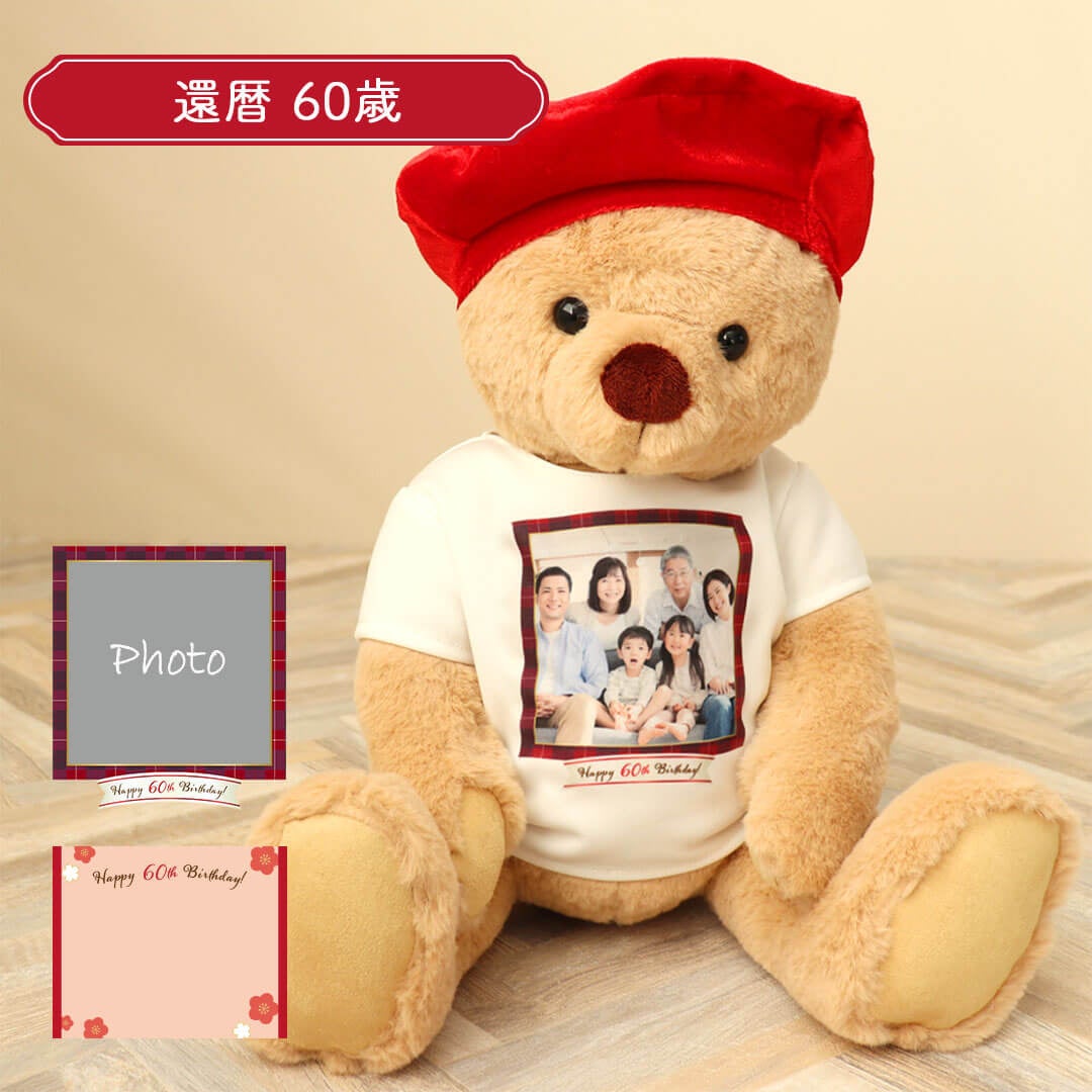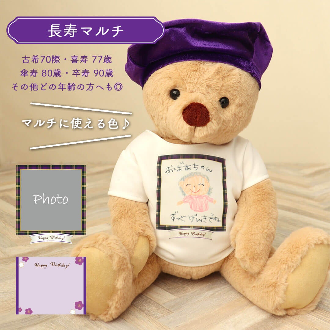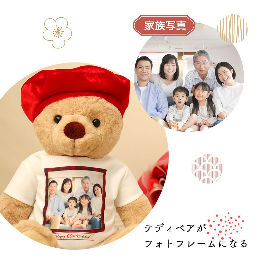 「ファミリー長寿ベア」はテディベアのTシャツに、オリジナルの写真またはメッセージをプリントした「家族の想い」がカタチになる、記念写真のようなテディベアです。