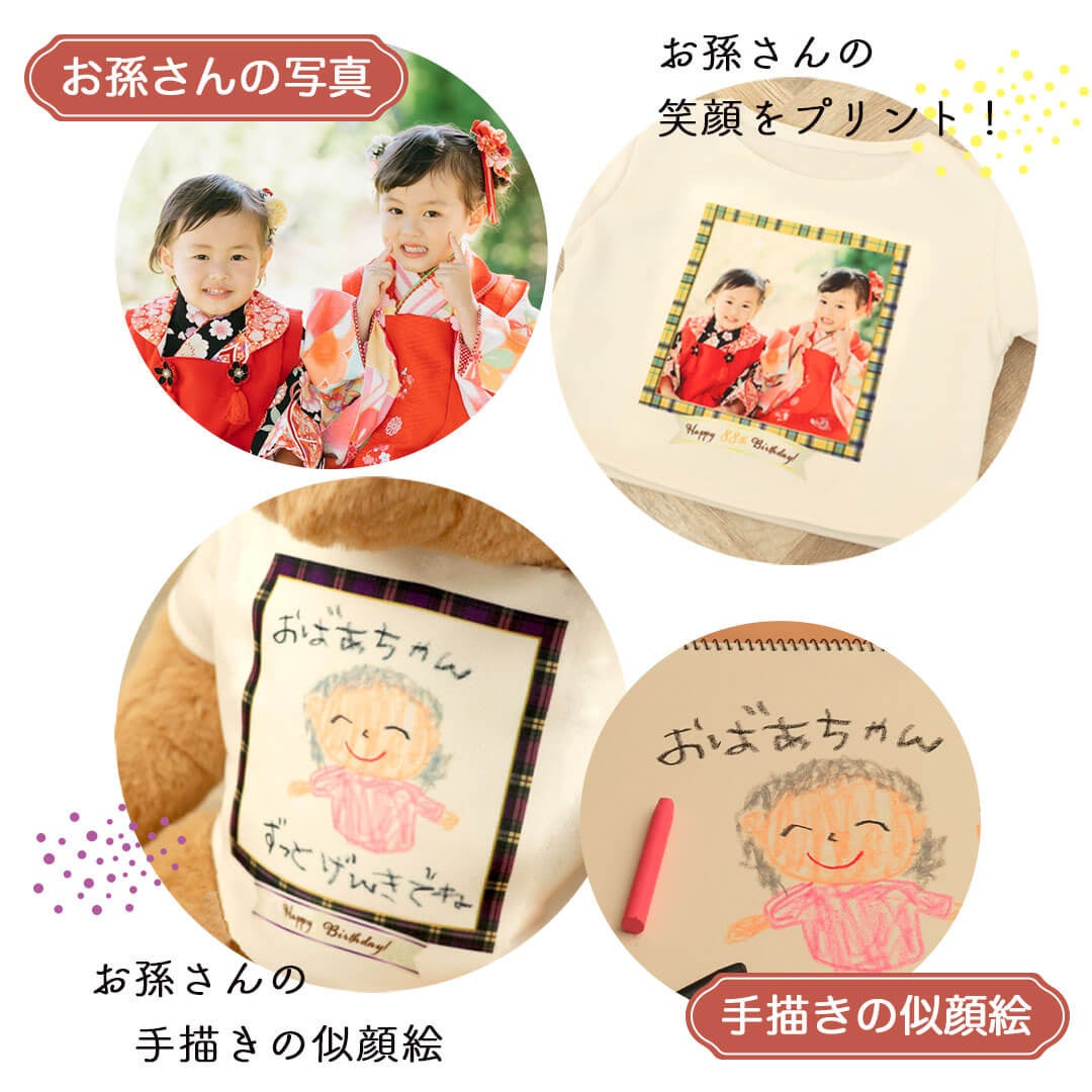 また、写真だけでなく、お孫さんが描いた手描きの似顔絵や、お祝いメッセージをプリントすることも可能です。