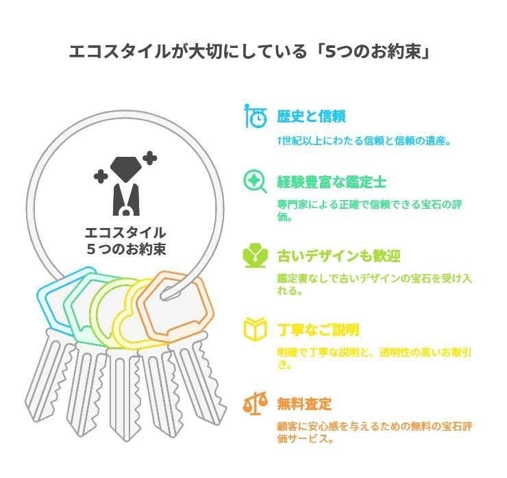 さらに、エコスタイルが宝石買取で選ばれる理由として、大切にしている 「5つのお約束」 を明確に打ち出しました。