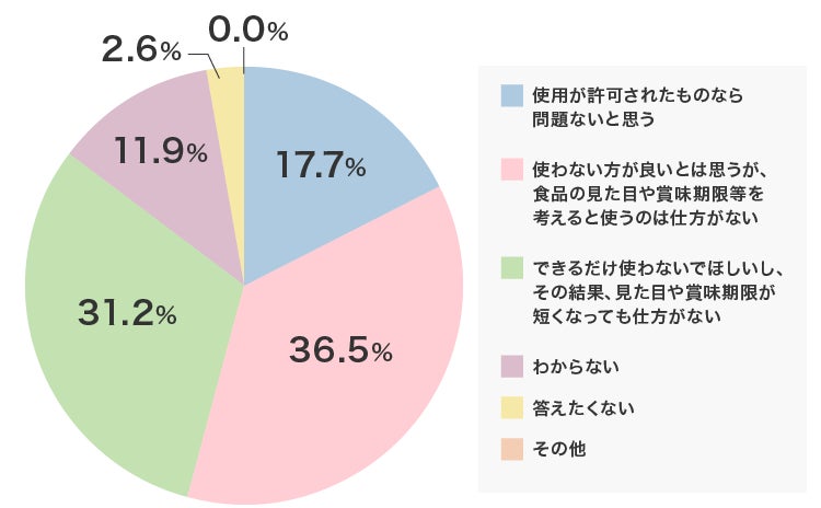 添加物の使用は「仕方がない」との回答と、添加物なしで賞味期限等に影響があっても「仕方がない」とする二つの反対の「仕方がない」との回答がきっこうしました。