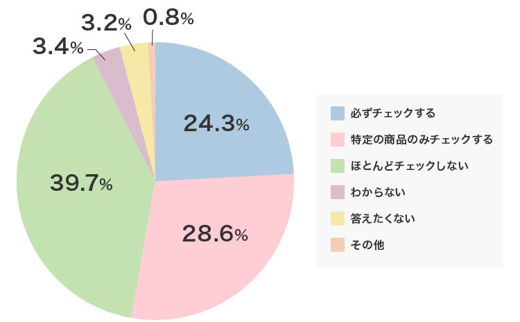 特定の商品のみチェックするという回答も合わせると、チェック派は半数をこえますが、こだわらない方も4割いらっしゃいます。