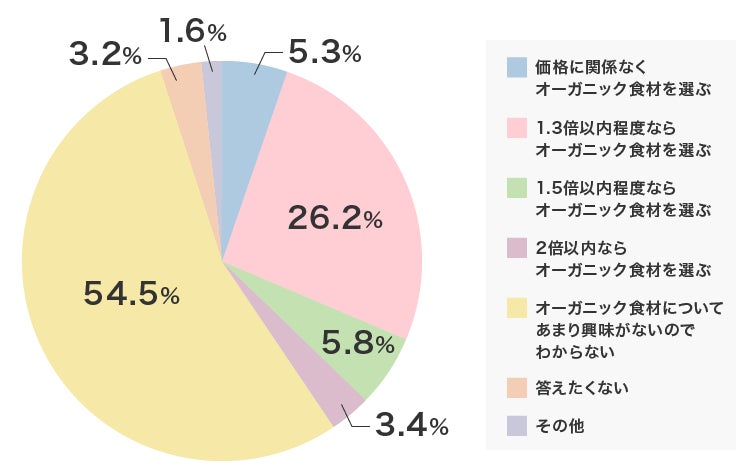 オーガニック食材を優先的に選ぶ場合、価格差が1.3倍以内ならとの答えが26.2%でもっとも多くなりました。