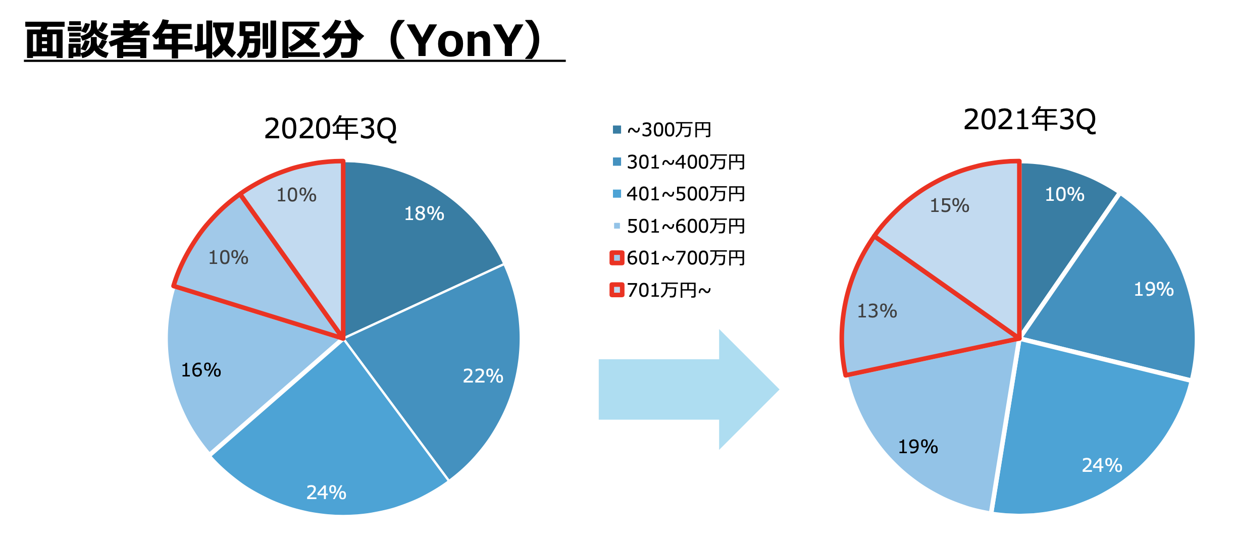 特にITコンサル業界×システムコンサルタントの採用決定数は、QonQ(前四半期との比較)で325%と伸長しました。ITコンサル・PM職種の求人がQonQで111%と伸長し、求人マーケット全体が過熱している状況です。求職者サイドでは、ハイクラス求職者の転職活動が活発化しています。