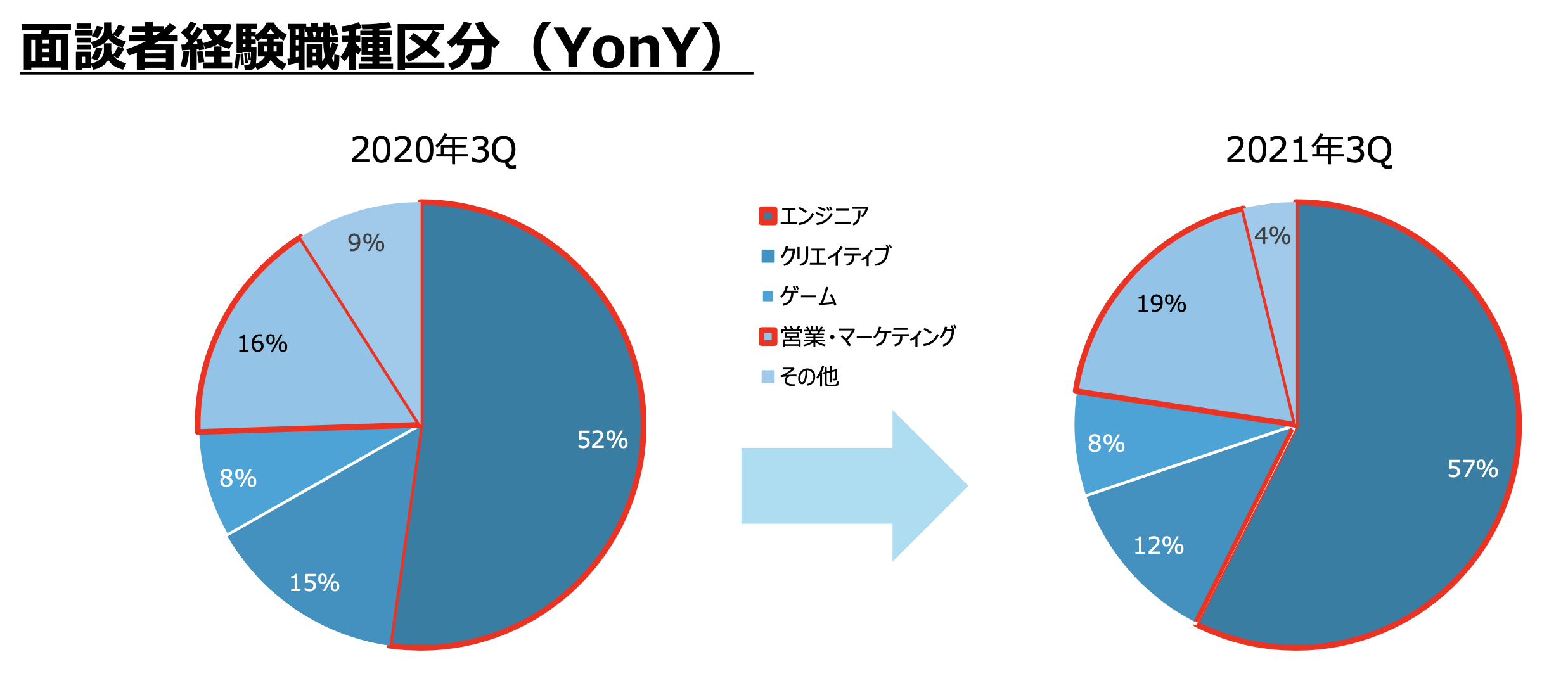 YonY(昨年第3四半期との比較)にて、エンジニア、営業・マーケティング職の登録者数が増加しました。特に集客におけるエンジニアの比率は歴代最高の57.5%を記録しています。エンジニアの集客拡大は、事業会社のDX化のニーズ高騰をはじめとして、SaaS系企業、Sler、コンサル企業のエンジニア求人数の大幅増加を受けた集客拡大を反映する結果となりました。また営業・マーケターの集客比率の増加は、コロナウイルスの感染拡大が落ち着いたことで、販売促進のニーズが高まったことで集客を強化したことが要因となります。