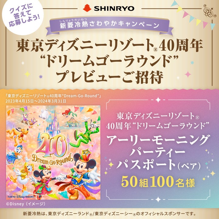 新菱冷熱工業株式会社は、2023年4月13日に東京ディズニーランド®にて開催される「東京ディズニーリゾート®40周年“ドリームゴーラウンド”アーリーモーニング・パーティー」に、クイズに答えて正解者の中から抽選で50組100名様をご招待するキャンペーンを、2022年12月15日(木)から2023年1月31日(火)まで開催します。