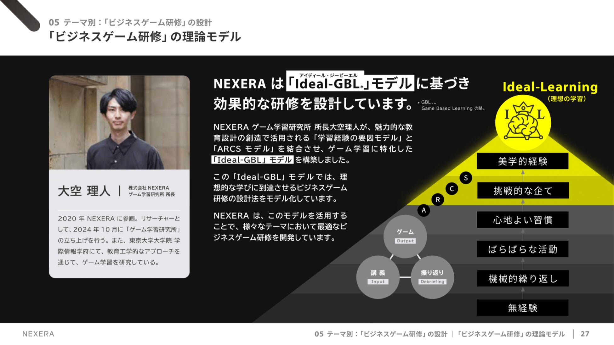 NEXERAゲーム学習研究所 所長 大空理人は、魅力的な教育設計の創造で活用される「学習経験の要因モデル」と「ARCSモデル」を結合させ、ゲーム学習に特化した「Ideal-GBL*」モデルを構築しました。 *Ideal-GBL…Ideal-Game Based Learning(理想的なゲーム学習)の略。