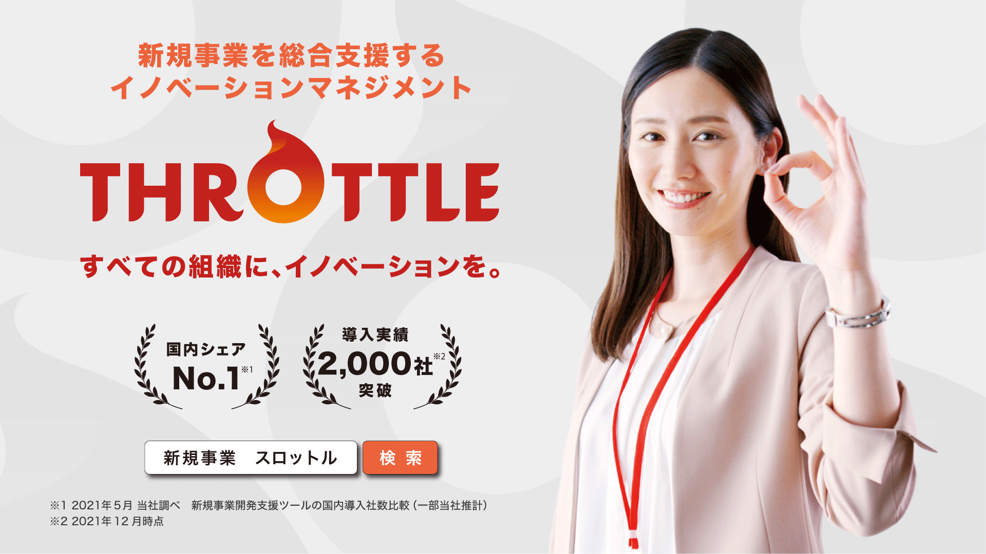 『Throttle』は新規事業創出プログラムや社内ベンチャー制度、オープンイノベーションやアクセラレーションプログラム等を含む、すべての新規事業開発やイノベーション創出のための活動に最適化されたSaaS型イノベーションマネジメント・プラットフォームです。今後の日本企業においてイノベーションマネジメントの概念や手法が普及し、新規事業創出への取り組みを試みる企業が増加していくと想定される中、新規事業開発やオープンイノベーションにおけるアイデア創出から事業化に至るまでの一連のプロセスを一元的に管理・運用できる仕組みとテクノロジーを提供することで、挑戦する企業や組織の支援を行うことを目的に2019年8月より提供を開始しました。これまでに2,000社以上に導入され、5万人以上のユーザーに利用されるなど、国内シェアNo.1の導入・利用実績を誇ります。