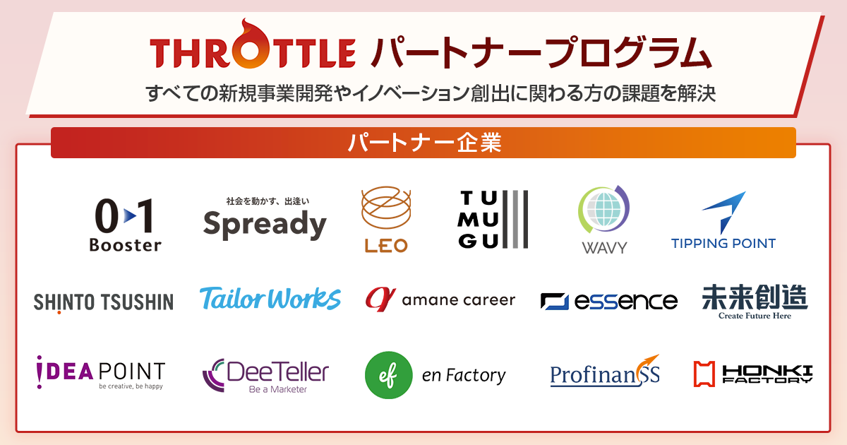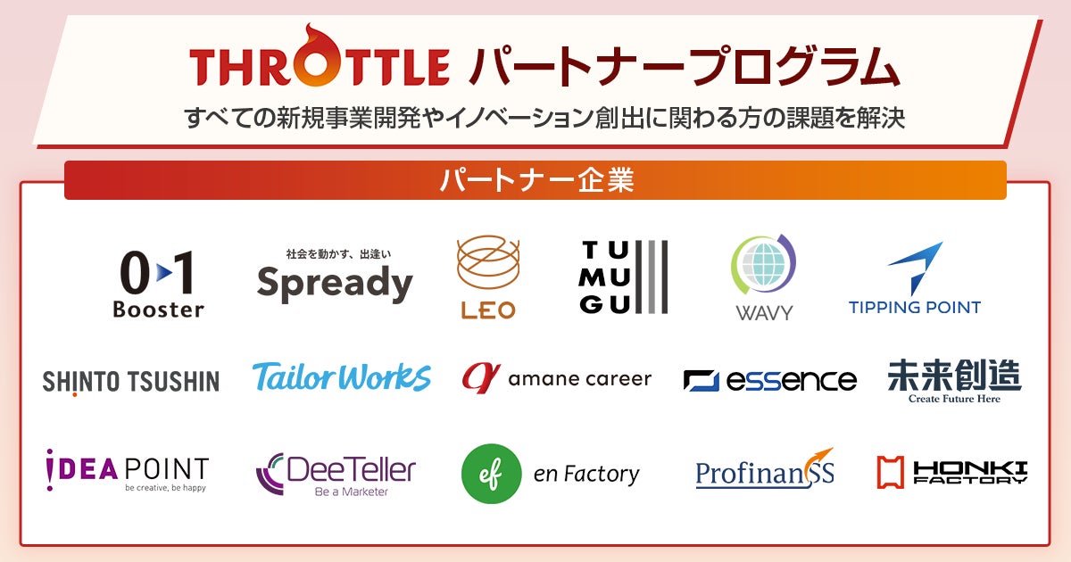 当社は、新規事業に出会えるプラットフォーム「Spready」、新規事業に伴走する「Spready Mentoring」と共に『Throttle』の販売も始めることで、大企業における新規事業のトータルソリューションパートナーを目指していきます。