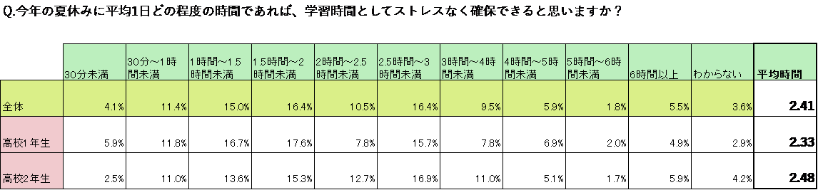 その規則正しい生活の中で、「どの程度であればストレスなく学習時間が確保できるか」といった質問に対しては、平均で「2.41時間」という回答結果に。毎日2時間半程度であれば、生活習慣として学習を無理なく続けられるという結果になりました。