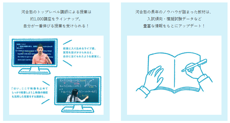 河合塾の先鋭講師による全国で評価の高い「映像授業」とアドバイザーによる「サポート」を軸に、志望校合格に向けて必要な力を効率的に引き出します。