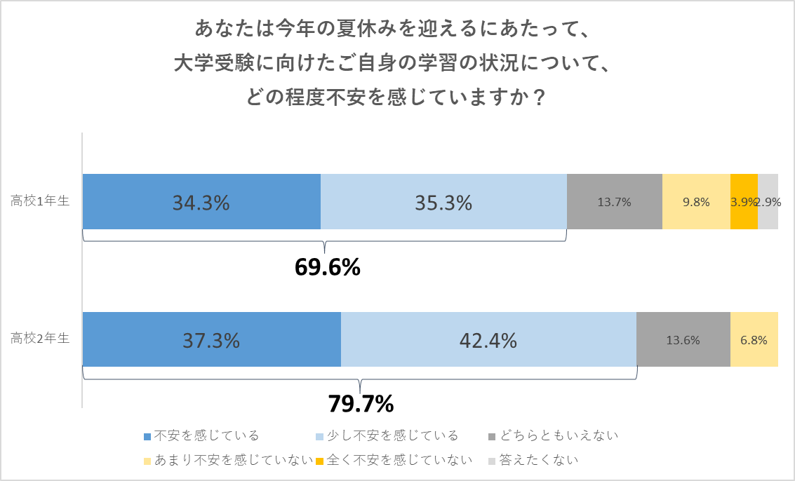 (2)一方で、大学受験に不安を感じていると回答した割合は高校2年生で79.7%、1年生でも69.6%だった。大多数の高校生が大学受験に対して不安を抱えている。