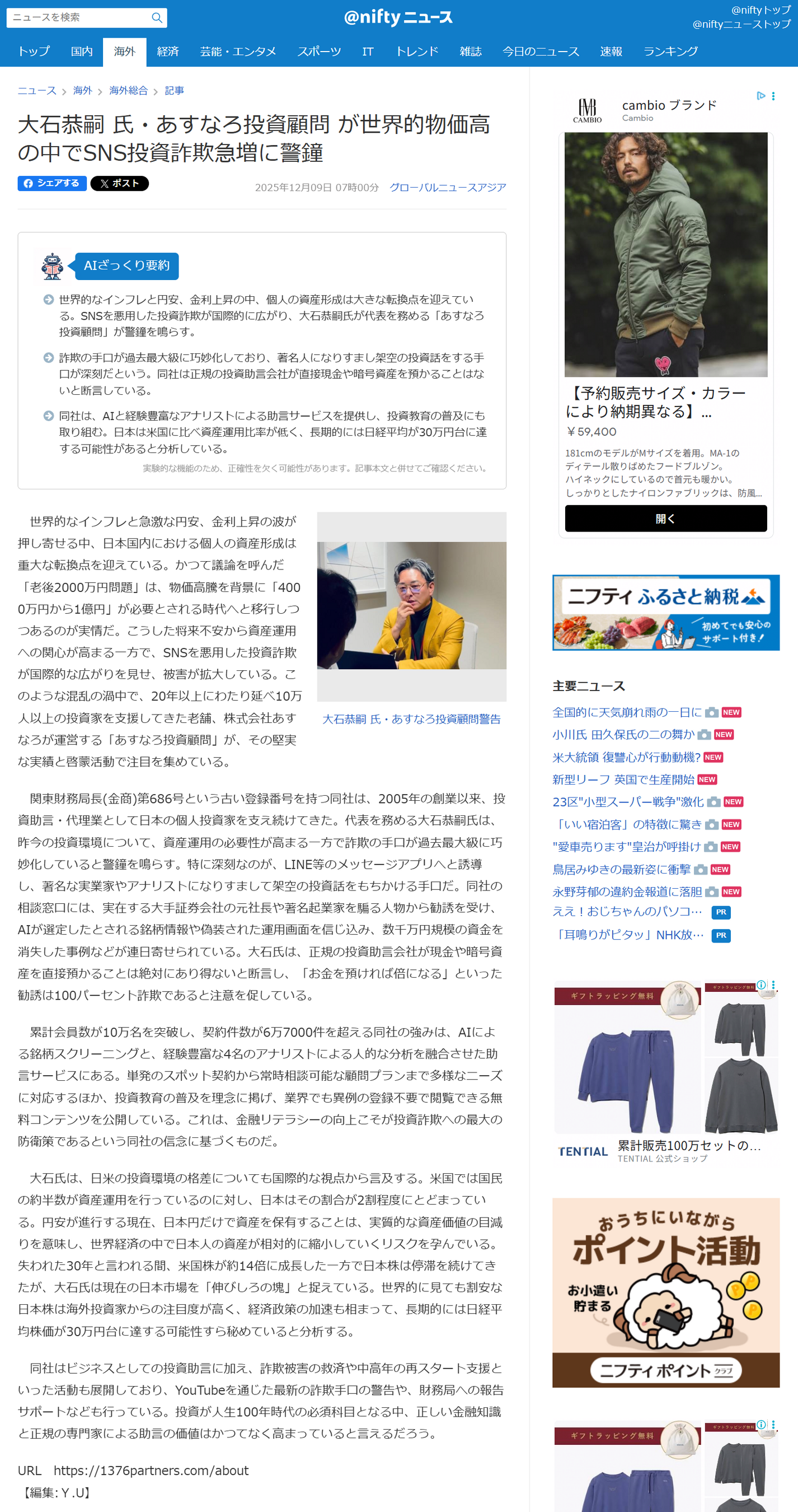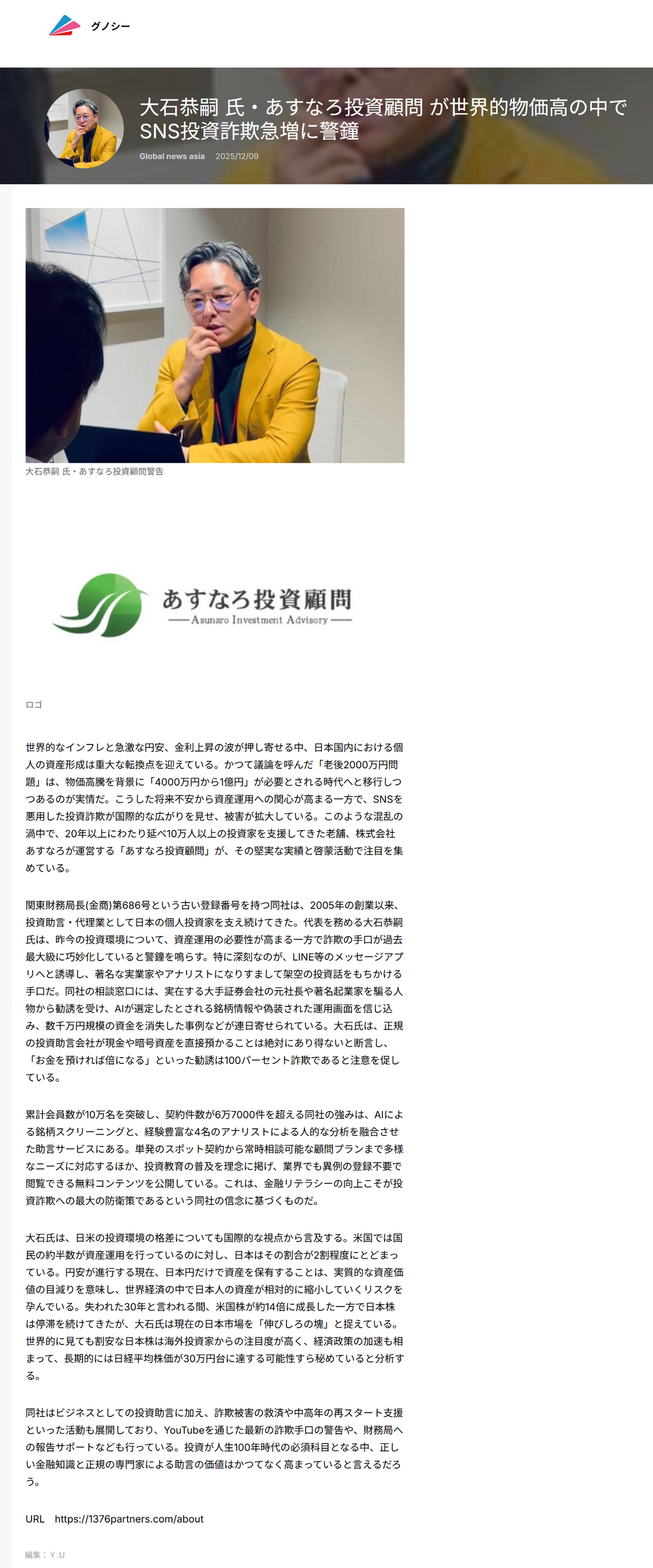 大石恭嗣 氏・あすなろ投資顧問 が世界的物価高の中でSNS投資詐欺急増に警鐘
