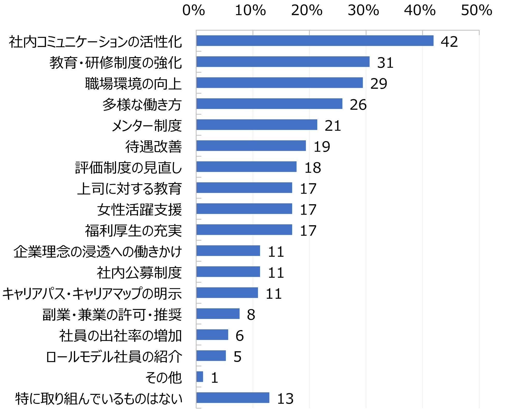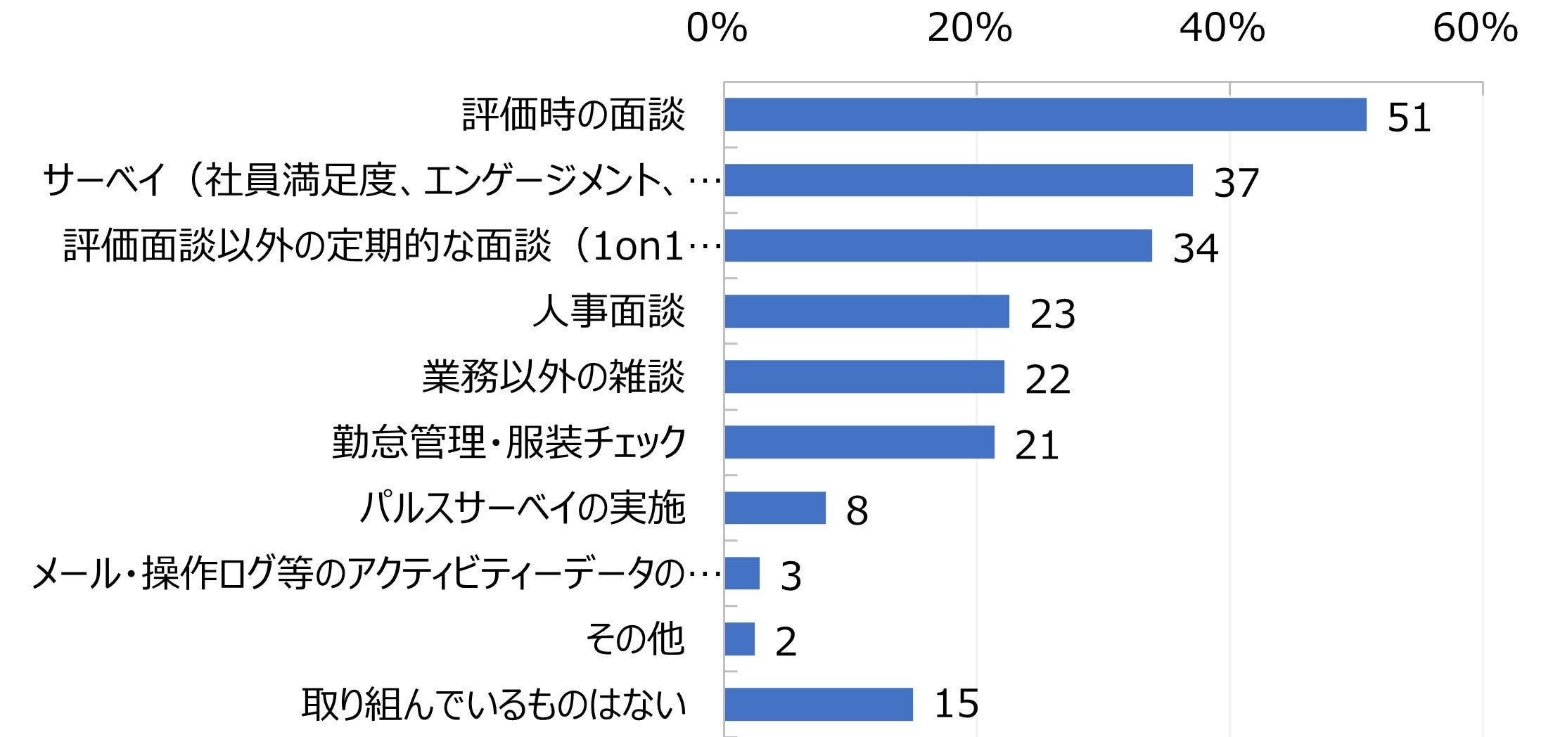 そして、組織サーベイ(現在3分の1以上の企業が実施)などで社員の状況を把握したり、効果があると導入企業(現在5%ほど)の半数以上が述べているロールモデルとなる社員の紹介をしたり、導入企業の6割が効果ありとしている待遇の改善をしたりするなど、リモートワークなどでも実施しやすい施策の導入の検討が必要かもしれない。