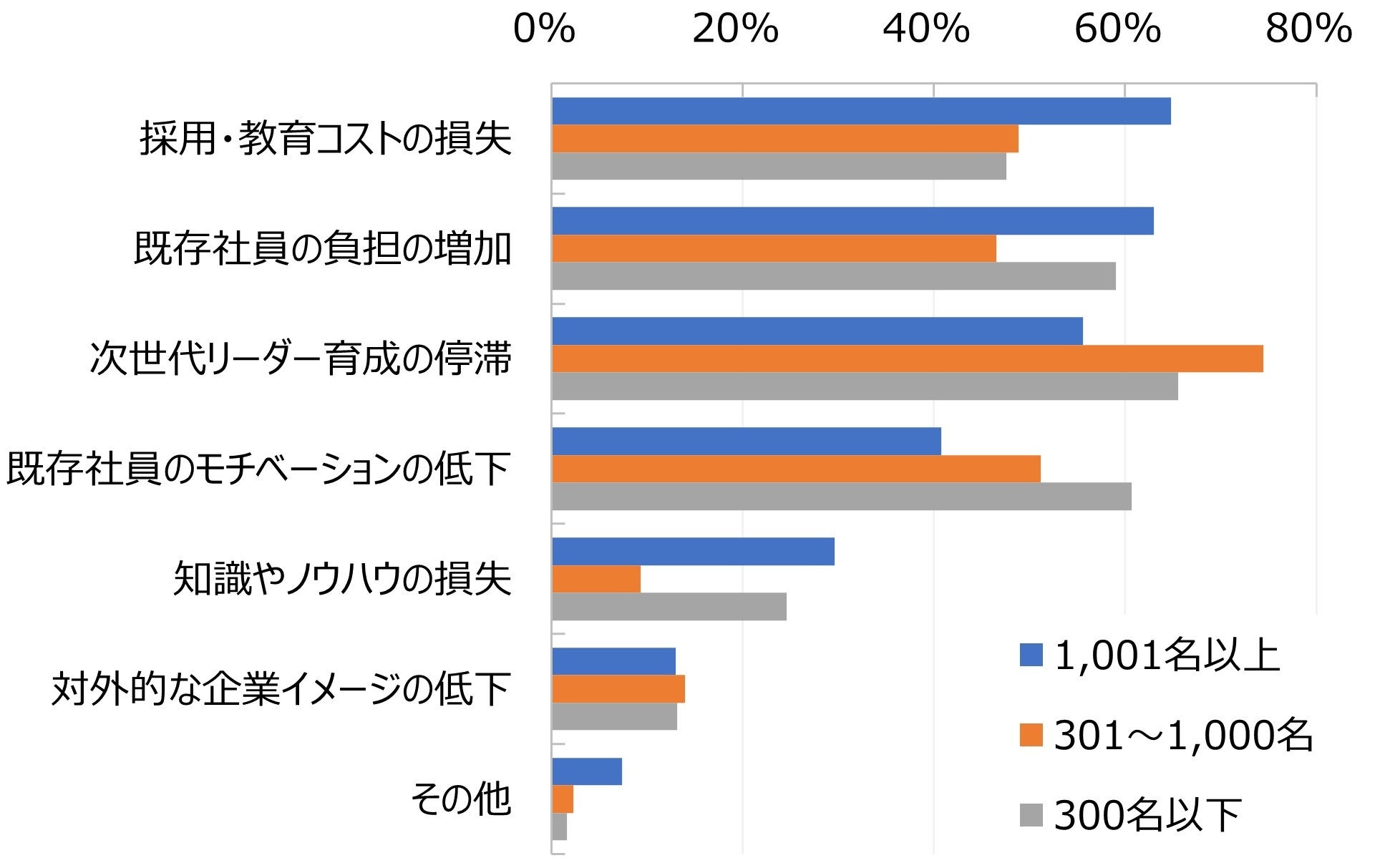 企業規模を問わず、若手の離職は「次世代リーダー育成の停滞」が課題として高い結果となっており、単なる人手不足への影響だけでなく、会社の未来への不安感を募らせることが伺える。若手は今も昔も「希望の星」ということは変わらない。