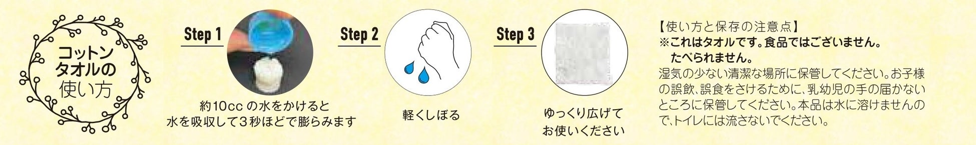 個包装からタブレット状の圧縮タオルを取り出し、水に浸してほぐせばすぐに使うことができます。