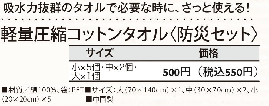 ・商品名:軽量圧縮コットンタオル(防災GOODS)
