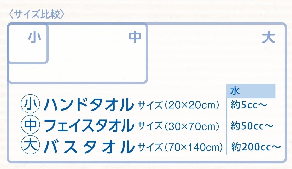 手のひらサイズくらいからバスタオルほどの大きさが入っており、コットンなので触り心地良し。