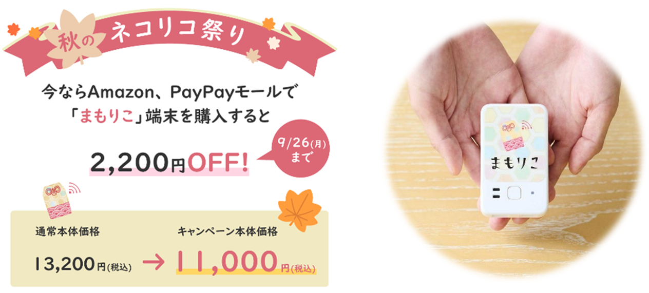 合同会社ネコリコ(本社:東京都千代田区、代表:木全英彰、以下、「ネコリコ」)は、本日から9月26日(月)まで「秋のネコリコ祭り」と題して、「BOCCO emo LTEモデル Powered by ネコリコ」と「まもりこ」のお得なキャンペーンを開催します。