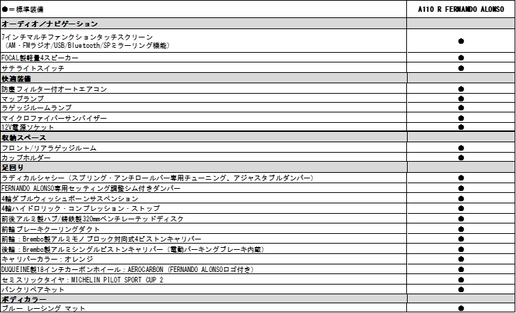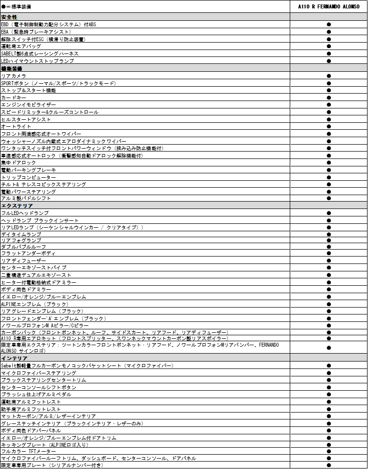 - アルピーヌ A110 R FERNANDO ALONSO装備表