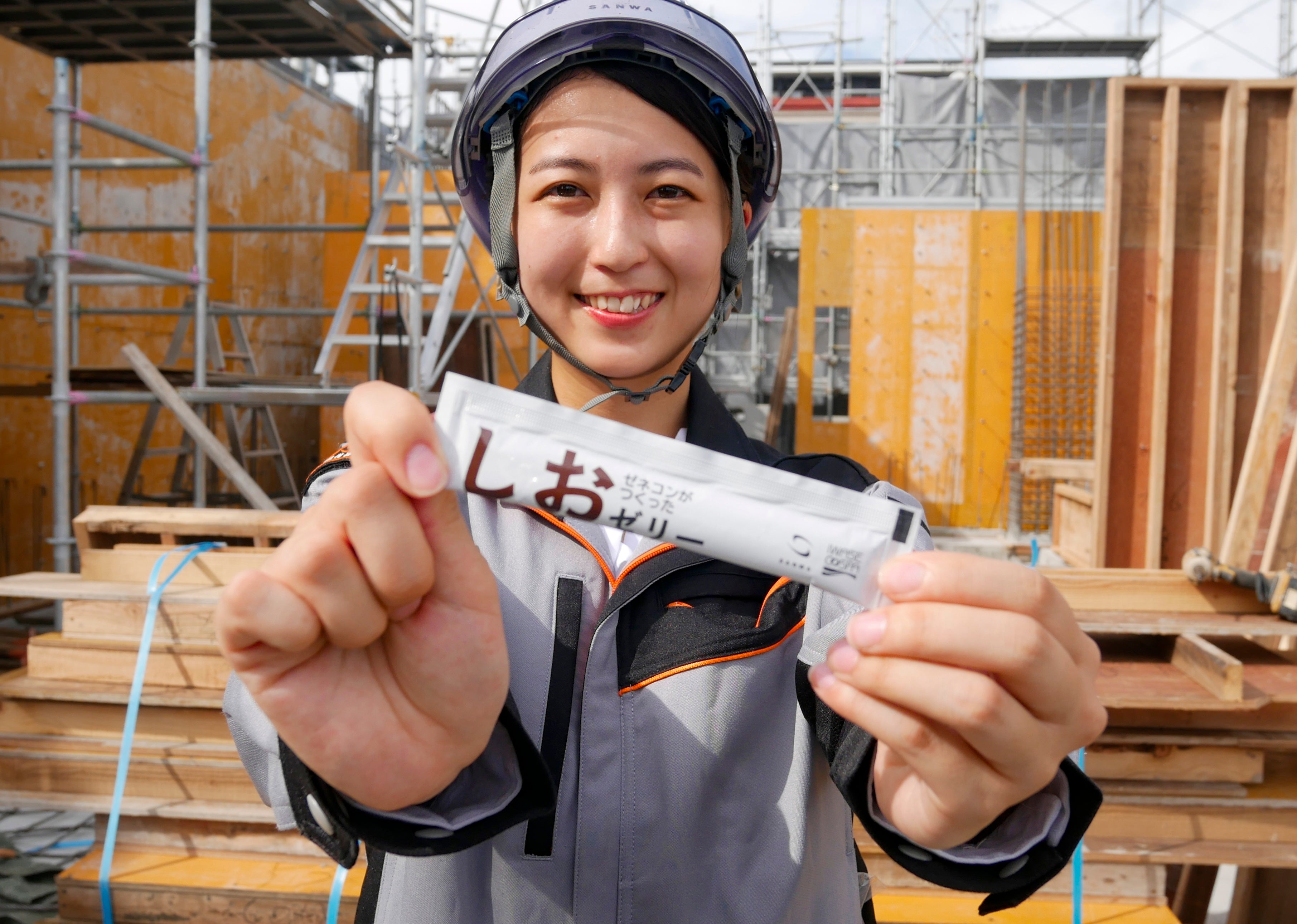 ①自社開発「ゼネコンがつくったしおゼリー」を作業員に無償配布