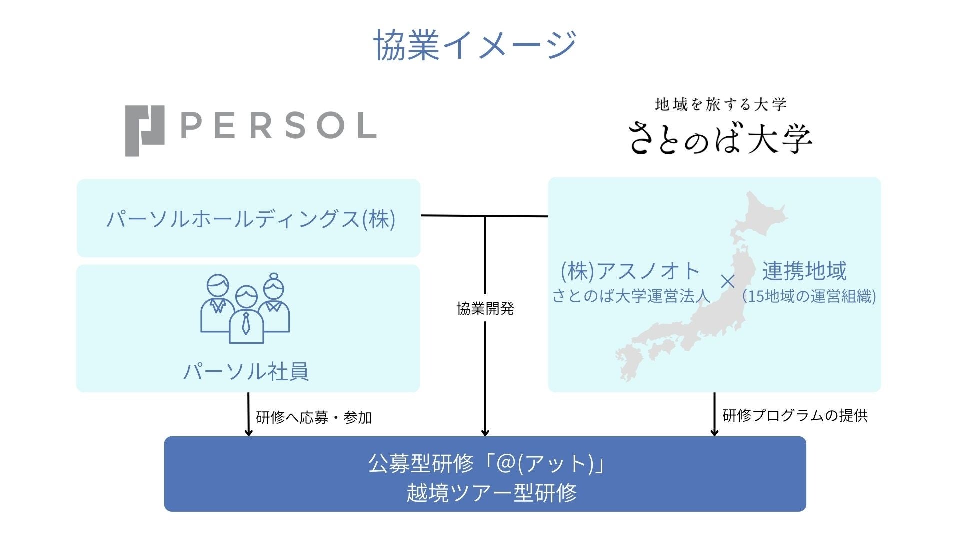株式会社アスノオト(所在地:東京都千代田区、代表取締役:信岡 良亮)が運営する地域を旅する大学「さとのば大学」は、「はたらいて、笑おう。」をグループビジョンに掲げるパーソルホールディングス株式会社(本社:東京都港区、代表取締役社長 CEO:和田 孝雄、以下パーソルホールディングス)と初めて協業し、さとのば大学が連携する全国15地域をフィールドにした越境ツアー型研修を共創します。パーソルグループの社員を対象に、キャリアオーナーシップを育み、生涯にわたる豊かな人生やキャリア形成につなげるための新たな研修プログラムを開始します。