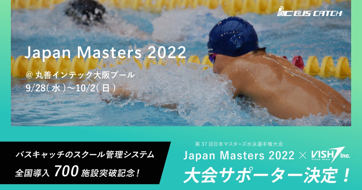 VISH株式会社(本社:愛知県名古屋市、代表取締役:田淵浩之)は、2022年9月28日(水) ~ 10月2日(日)に開催される「第37回日本マスターズ水泳選手権大会 (ジャパンマスターズ2022)」の大会サポーターとして、協賛を決定いたしました。同大会は、一般社団法人日本マスターズ水泳協会が主催する国内最大の成人競泳競技会となります。