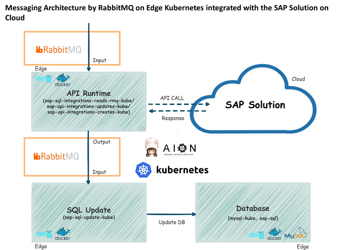 以下のアーキテクチャ図は、クラウド上のSAP ソリューションと統合されたエッジKubernetes環境上において、特定のインプット・アウトプットに対してRabbitMQが軽量なメッセージング・アーキテクチャとして機能し、高速で安定的なAPIランタイム環境とエッジデータベース・データベース更新環境が提供される一連の流れを図式化したものです。