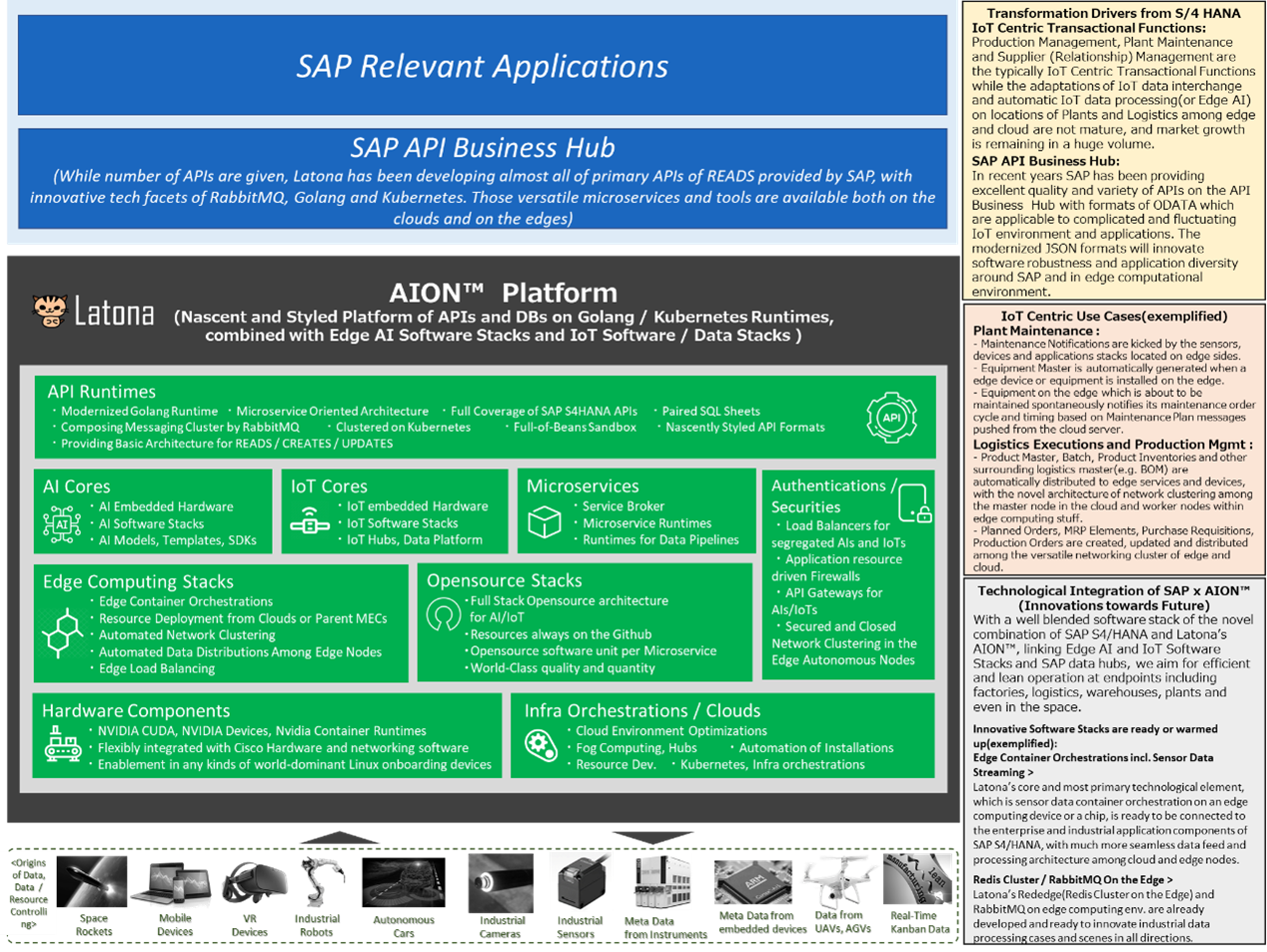 SAP S4/HANA®とラトナのAION™という先進的な組み合わせのソフトウェアスタックをうまく融合させ、エッジ環境のEdge AIやIoTソフトウェア・アプリケーションとクラウド・オンプレミス環境のSAPデータハブを連携させて、工場、物流/倉庫、小売、ロボティクス、プラント、インフラ、自然環境監視、さらには宇宙機器制御運用システムなどの産業シーンにおいて、現場エンドポイントと統合企業環境での効率的で無駄のないデータ・アプリケーション運用を目指します。