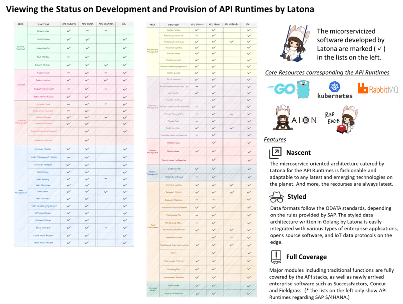 ラトナが開発したAPI Runtimesでは、SAP S/4HANAの以下の機能がカバーされています。また、S/4HANA®以外では、SAP® SuccessFactors®、SAP® Concur®、SAP® Fieldglass®をカバーしています。