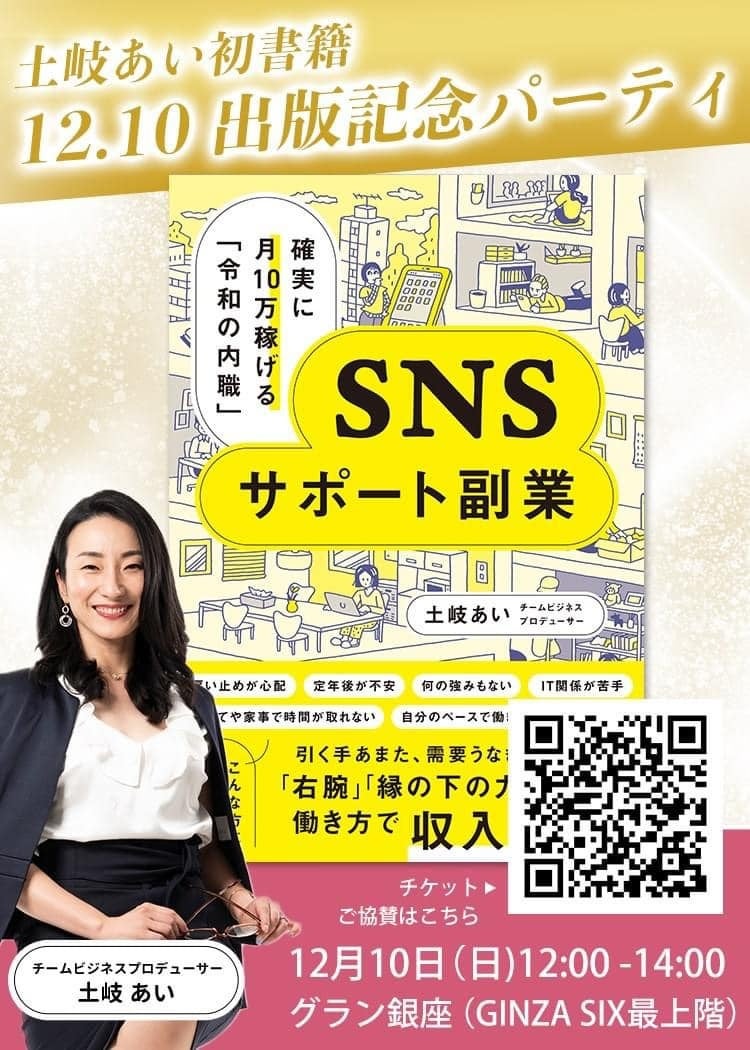 副業・フリーランスで未来の選択肢を広げる『SNSサポート副業』(著:土岐あい)出版記念パーティーを12月10日にGINZA SIX最上階で開催!