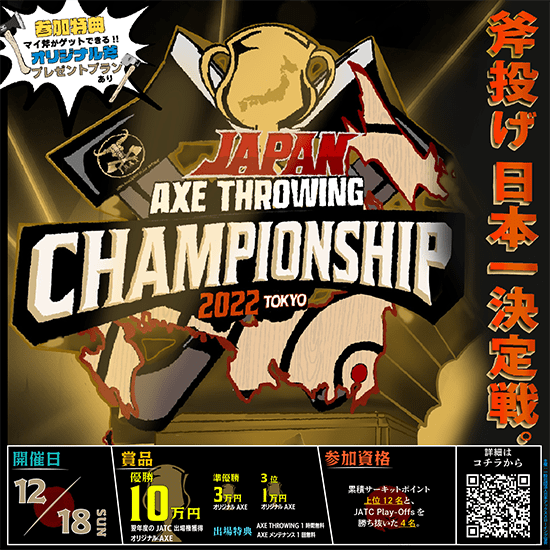 斧投げ日本一決定戦。「Japan Axe Throwing Championship 2022 @TOKYO」とは、2022年度の斧投げ日本一を決定するスポーツ大会のことです。この大会では、4月8日から12月11日の期間で実施される予選大会で、12月18日に東京で開催される最終大会(本戦)に出場する16名を選出します。選出方法は、まず、4月8日から11月27日の期間での累積サーキットポイント上位12名が選出されます。それに加えて、12月11日に東京と大阪で開催される <Japan Axe Throwing Championship Play-Offs 〜ダークホースになれ。〜> の各開催地上位2名の合計4名が選出され、最終大会(本戦)出場者16名が決定されます。