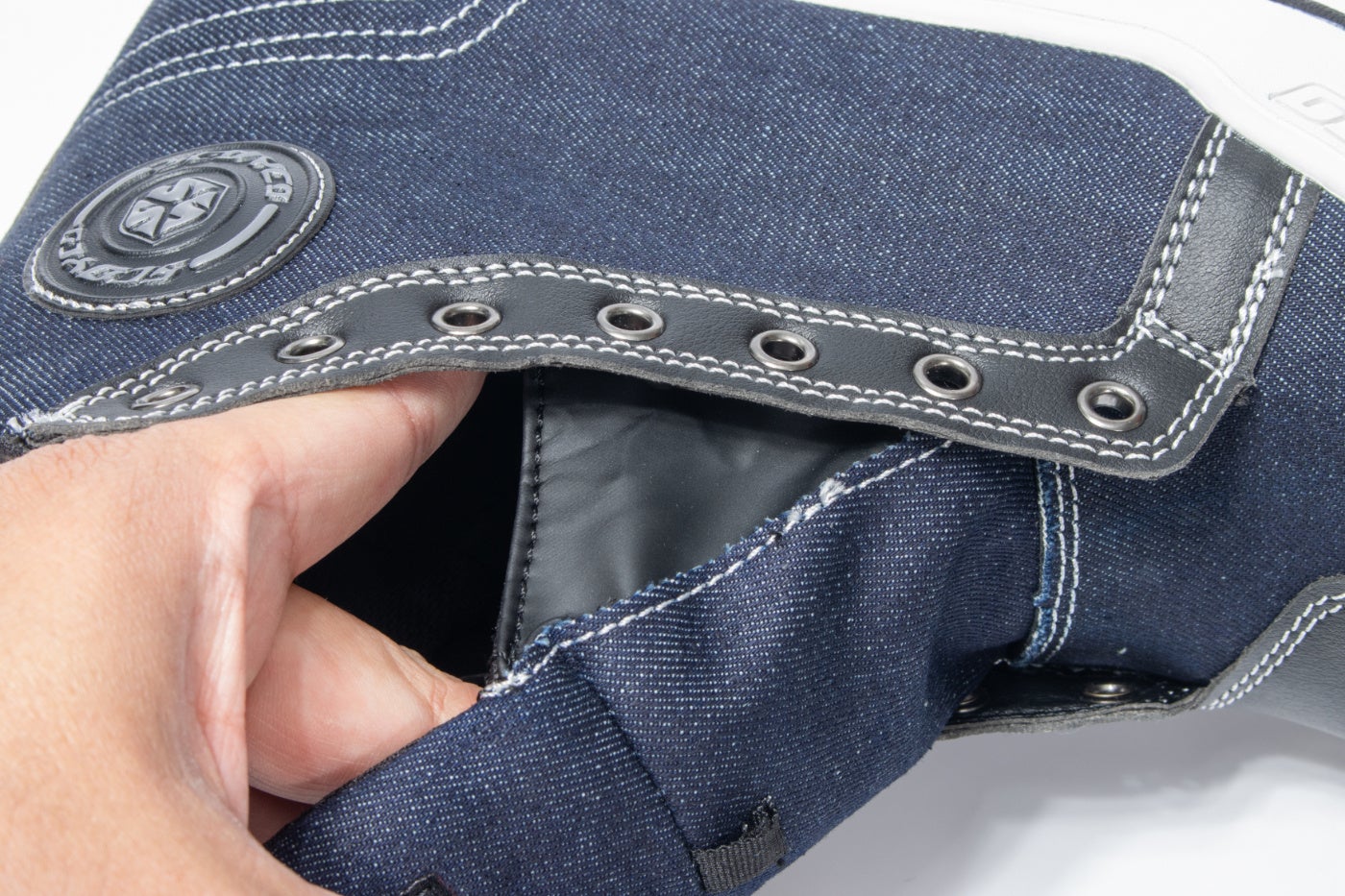 足首周りは厚めのクッション材が使われており、足を保護すると同時にバイクのエンジン熱を伝えにくくなっています。