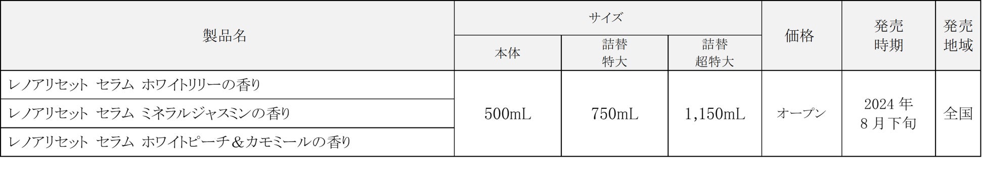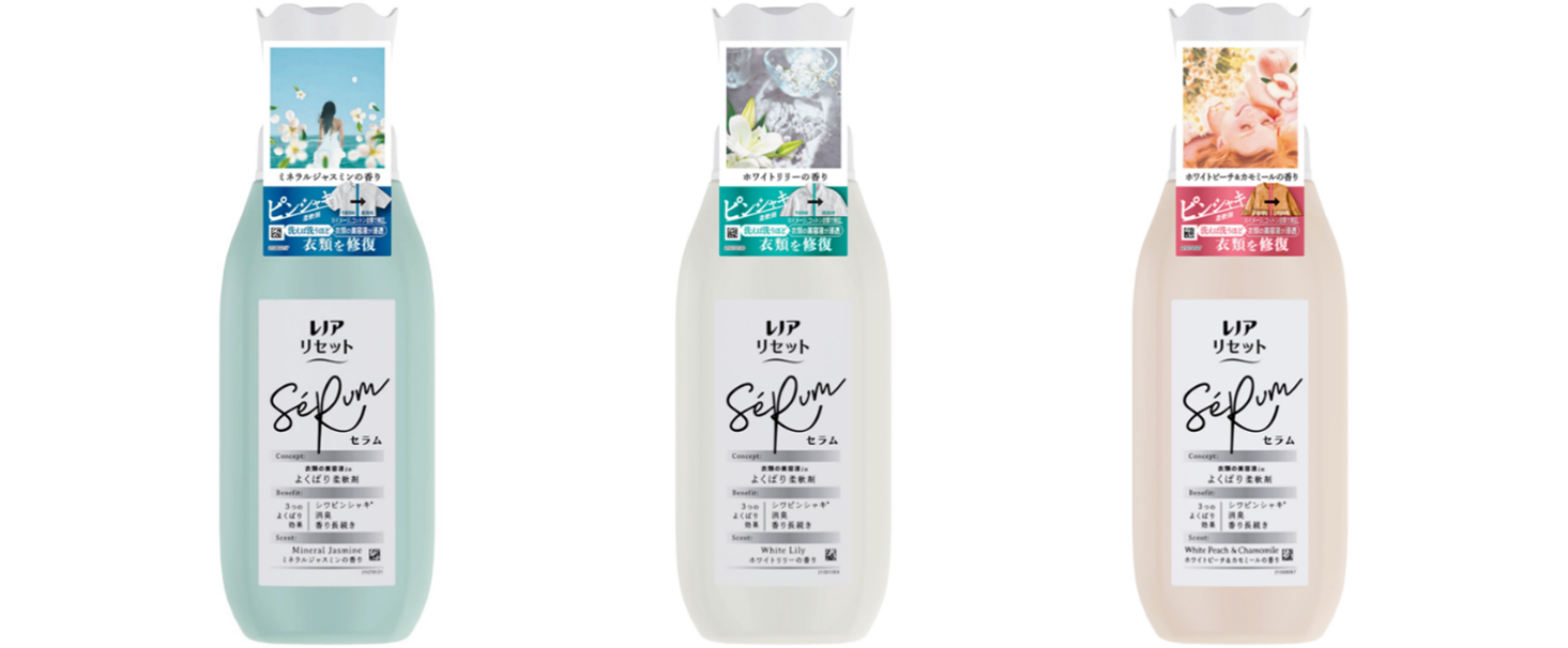 左から:「レノアリセット セラム ミネラルジャスミンの香り」「レノアリセット セラム ホワイトリリーの香り」「レノアリセット セラム ホワイトピーチ&カモミールの香り」