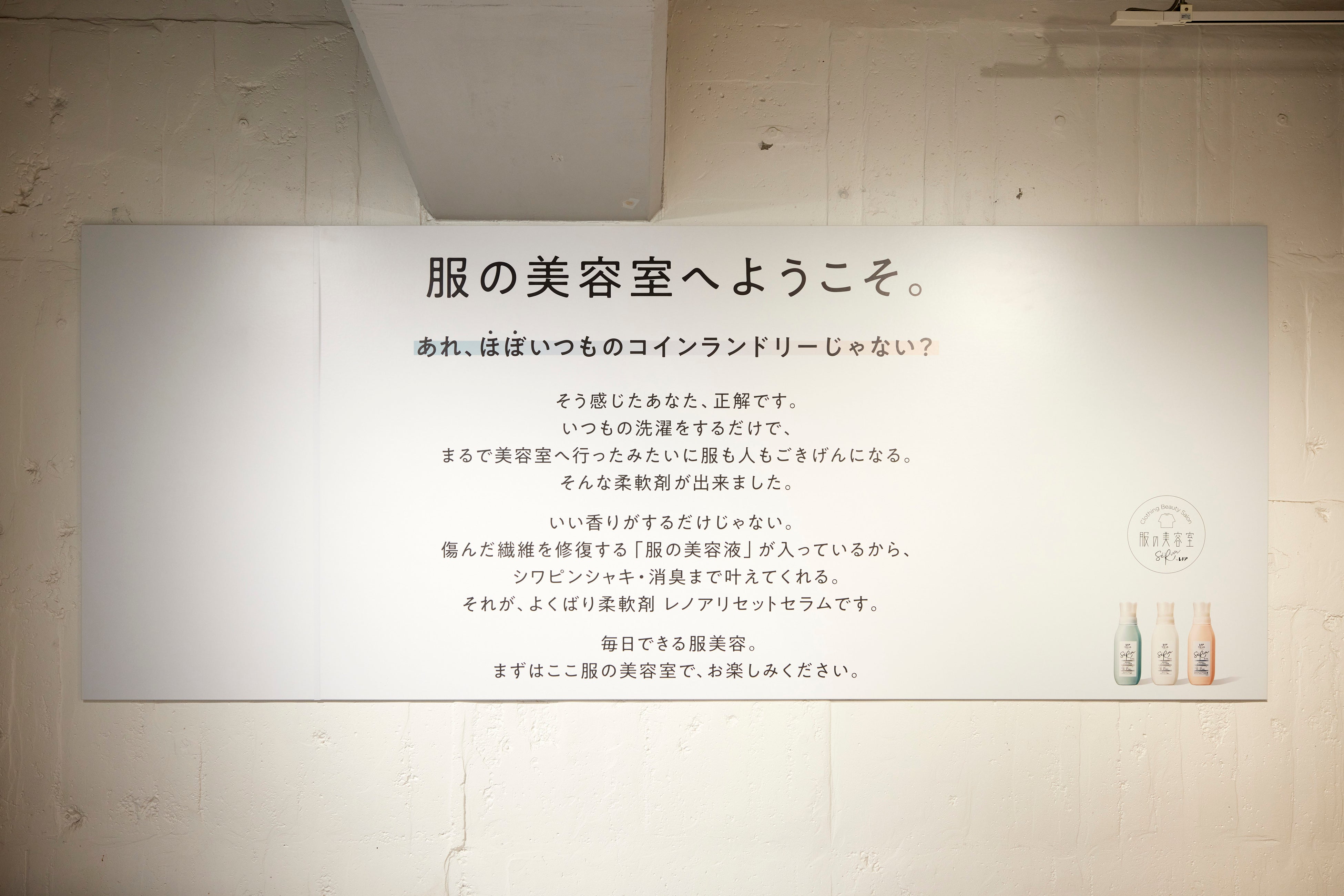 「服の美容室」は、「レノアリセット セラム」を期間限定で体験できるスポットです。服の美容液が入っている「レノアリセット セラム」は、シワピンシャキだけでなく、いい香りが長続きし、さらに消臭まで。毎日のお洗濯を通して、服をきれいに長く着られるように、服にもよろこんでもらえるように、そんな願いを叶えてくれます。