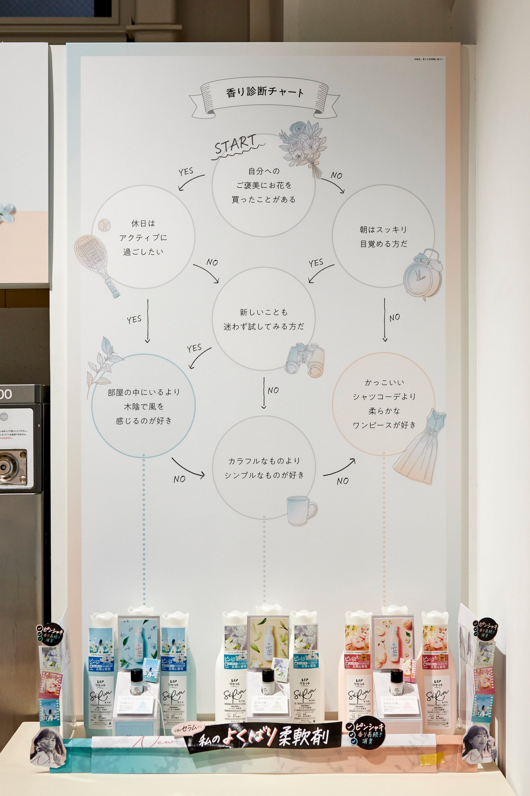 「服の美容室」では、そんな世界観を楽しめるフォトスポットや、あなたにぴったりの「レノアリセット セラム」の香り診断チャートも設置。清楚さと華やかさを併せ持つ「ホワイトリリー」、凛とした清々しさにほのかな甘さを感じる「ミネラルジャスミン」、みずみずしいホワイトピーチとカモミールのやすらぎに満たされる「ホワイトピーチ&カモミール」、3種類の香りから、あなたにぴったりの「レノアリセット セラム」を選んで、洗濯体験ができます。美容室のようなかわいい装飾のフォトスポットや洗濯体験の様子をSNSに投稿することで、ギフトのお渡しも予定しています。
