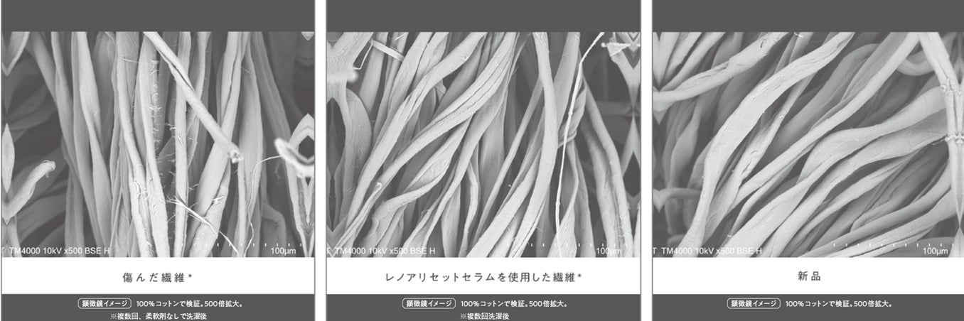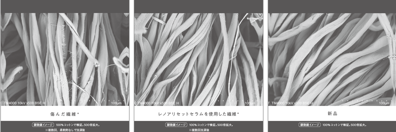 シワができにくく、消臭・防臭もでき、香りも長続き。顕微鏡で見ても、違いは明らかです。
