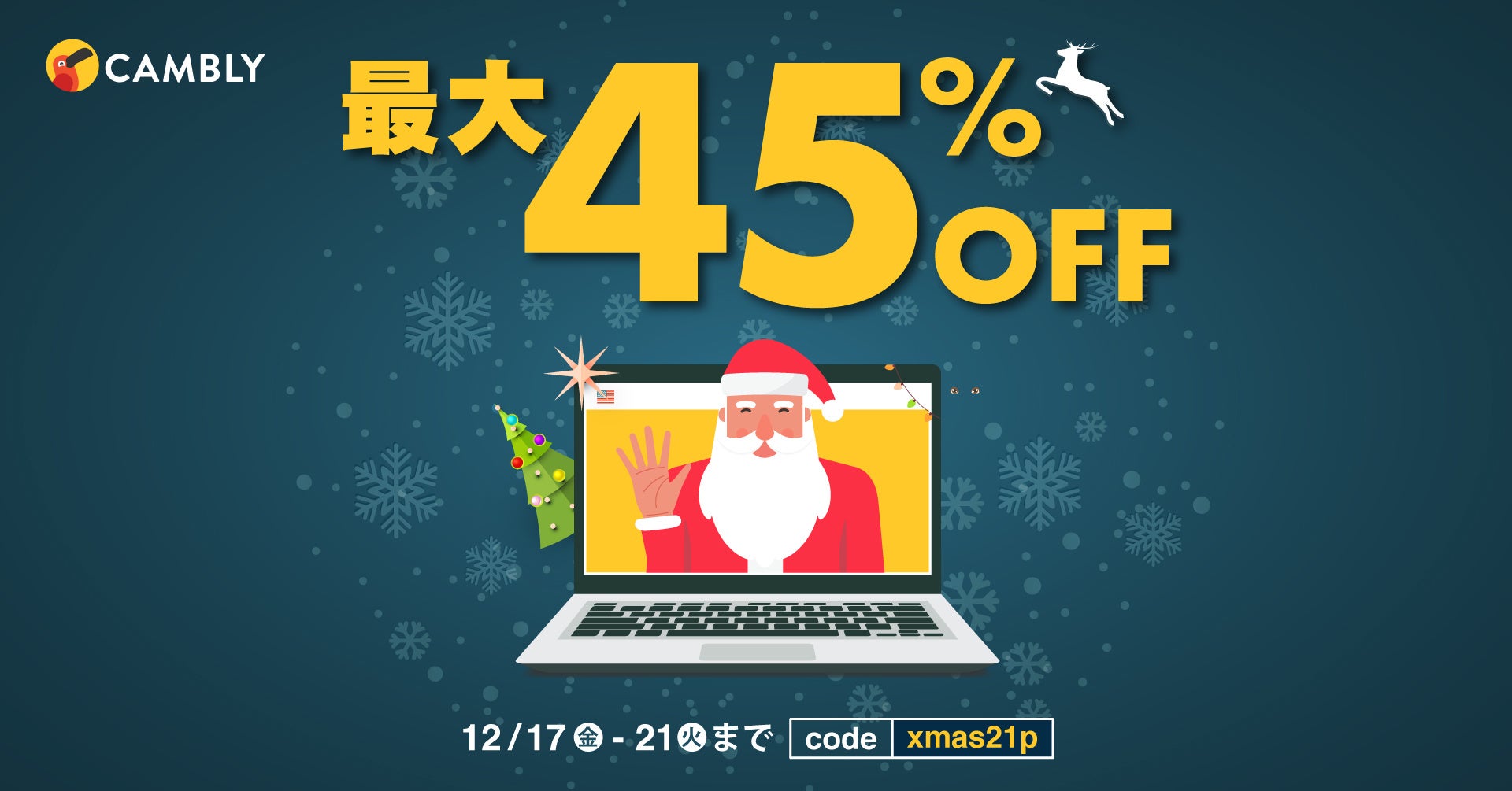 Cambly Inc.(本社:アメリカ・サンフランシスコ、日本代表:佐藤 亜希子)が提供するネイティブ講師とのオンライン英会話サービス「CAMBLY(キャンブリー)」は、 12月17日(金)〜12月21日(火)までの5日間、最大45%オフでご利用いただけるクリスマスセールを開催いたします。