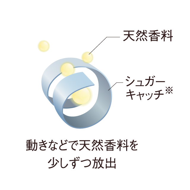 シュガーキャッチ※が天然香料を包み込み、髪がゆれ動く度に香料を放ちます。空になると汗臭・皮脂臭・タバコ臭などの嫌なニオイを閉じ込め、香りを長く楽しむことができます。※マルトデキストリン[香気成分]