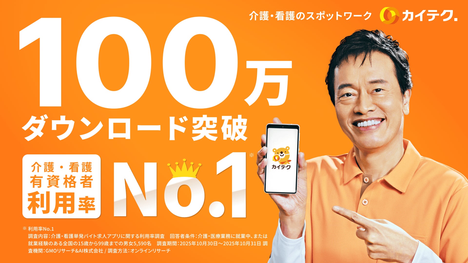 カイテク株式会社(本社:東京都新宿区、代表取締役社長:武藤 高史)は、このたび当社が提供する介護・看護のスポットワークアプリ「カイテク」において、累計100万ダウンロードを突破したことをお知らせいたします。また当社は、介護・看護スポットワークアプリにおけるアプリ利用率No.1※の評価を2年連続で獲得しております。