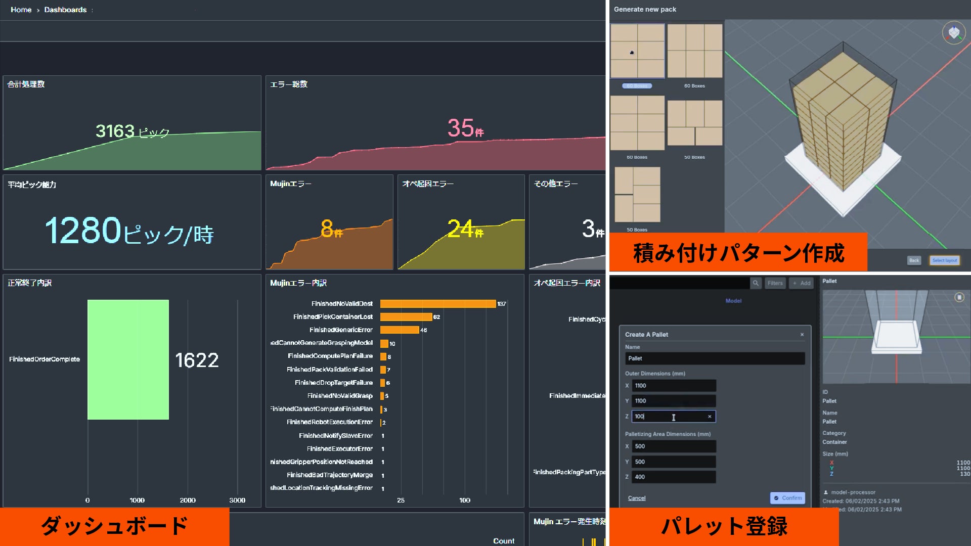 Mujinブースでは、実際にブラウザから積み付けパターンの設定、ロボット動作の自動生成、ダッシュボードによる状況可視化まで、自動化運用の一連の流れを実機と共にライブ体験いただけます。