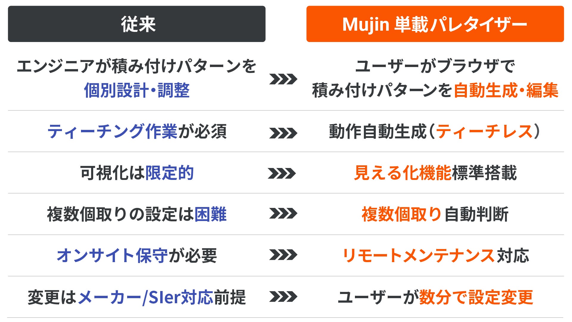 従来方式との比較:「Mujin単載パレタイザー」の革新性