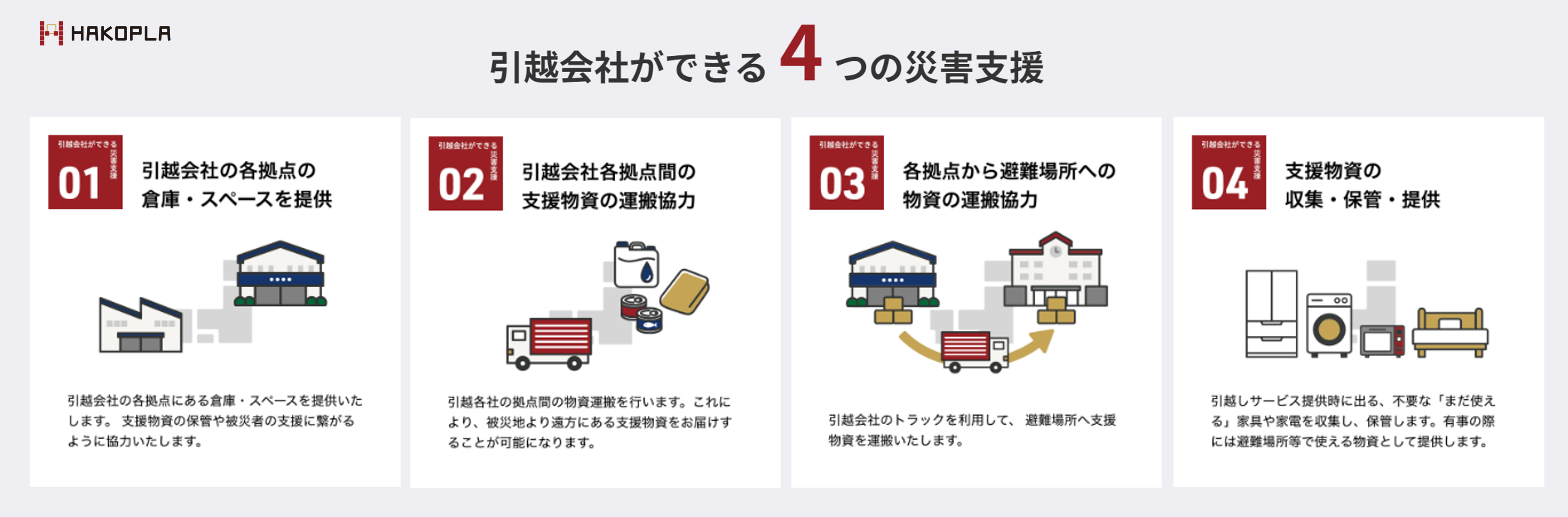 『HAKOPLA災害支援ネットワーク』に参加する引越会社は、各社が得意とする以下①~④のジャンルで支援活動への参加を表明しています。