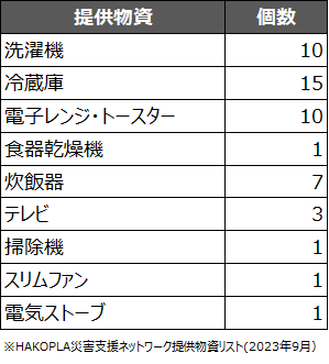 「被災者の皆様は家ごと流されて箸1本もない状態から生活の立て直しを余儀なくされています。そのような状況でニーズは高いが支援団体では集めるのが難しい大型家電をご提供いただき本当に助かりました。今は被災世帯へ個別に必要な生活物資をヒアリングしてニーズの把握を進めています。またご協力をお願いできたら助かります。」