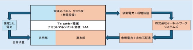 三ッ輪ホールディングス株式会社傘下の株式会社イーネットワークシステムズ(本社:東京都新宿区、代表取締役:及川浩、以下「ENS」)は、トーセイ株式会社(本社:東京都港区、代表取締役社長:山口誠一郎、証券コード:8923)の100%子会社であるトーセイ・アセット・アドバイザーズ株式会社(本社:東京都港区、代表取締役社長:塚田良之、以下「TAA」)の管理・運用する全106戸の賃貸マンション「T’s garden 稲城(東京都稲城市)」に設置された太陽光発電設備の余剰売電分を活用した新たなサービス(以下「本サービス」)の提供を開始いたしました。余剰売電分から創出された環境価値を利用してENSが共用部および専有部に供給する電気を実質再生可能エネルギー100%とすることで、物件内で再エネ価値の“地産地消”を推進してまいります。