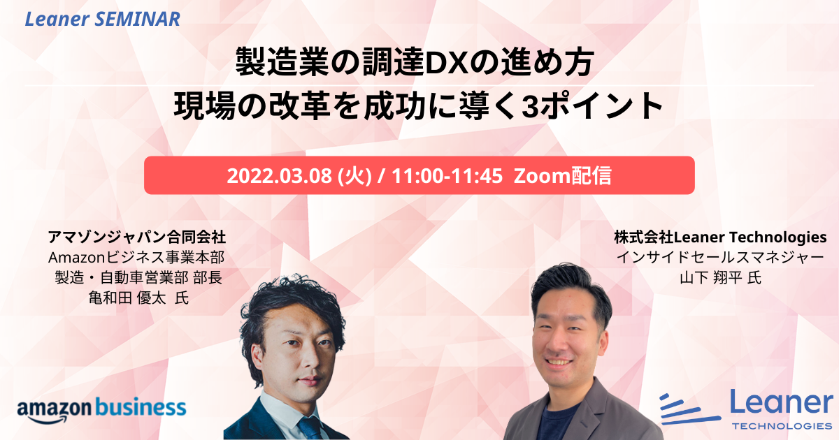 そこで今回、調達・購買領域のDXを進めているアマゾンジャパン合同会社、株式会社Leaner Technologiesの2社共催で「調達DXの進め方」をテーマとしたセミナーを行います。