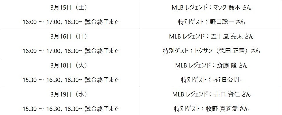 「MLB Tokyo Series presented by Guggenheim」のプレシーズンゲームと開幕戦の全6試合のパブリックビューイングを開催します。試合前にMLBで活躍した元選手とMLB好きのゲストによるトークイベントで盛り上がった後は、MLBレジェンドとゲストによる特別解説付きで試合観戦を楽しんでいただきます。
