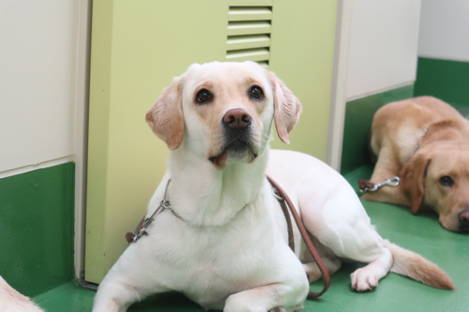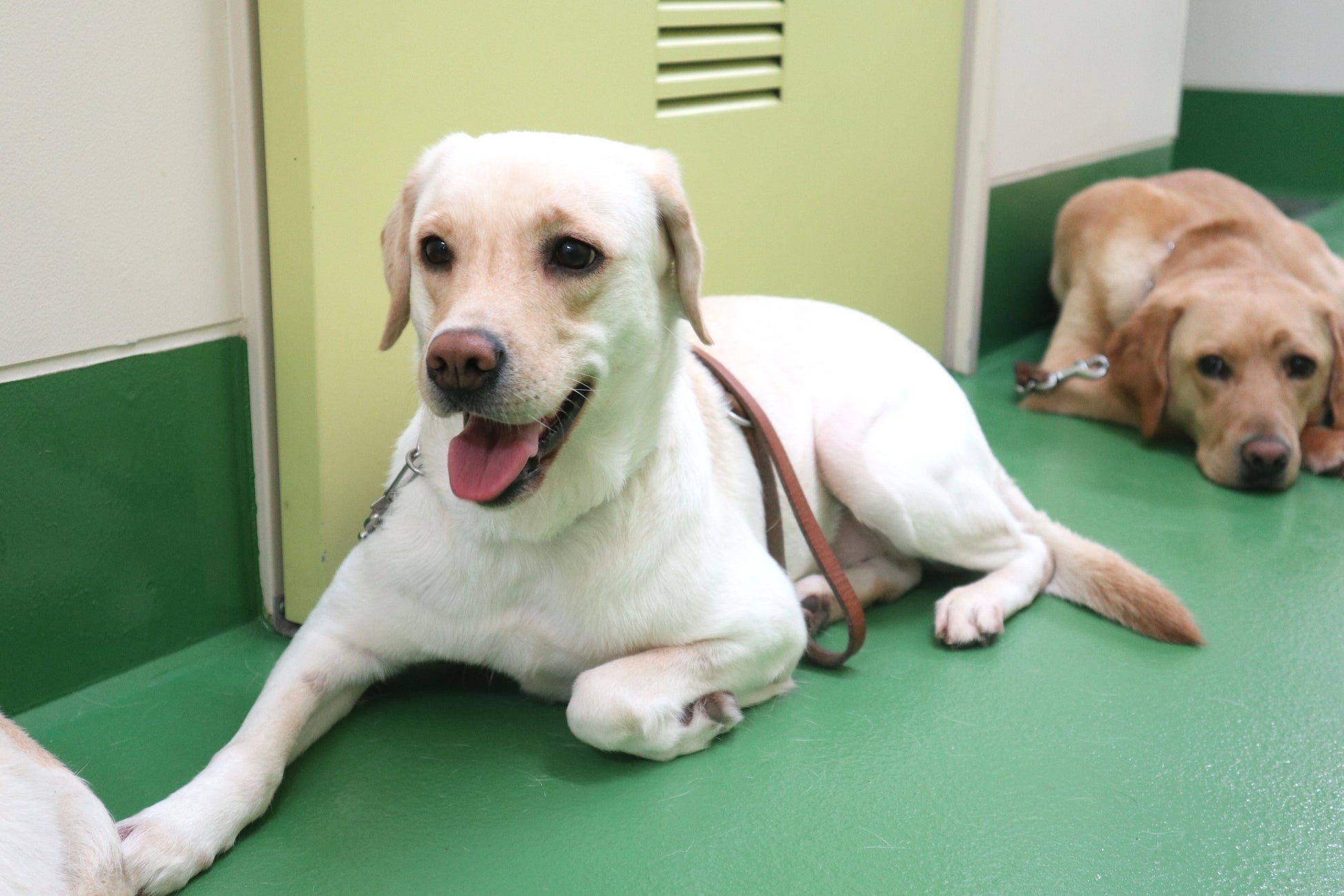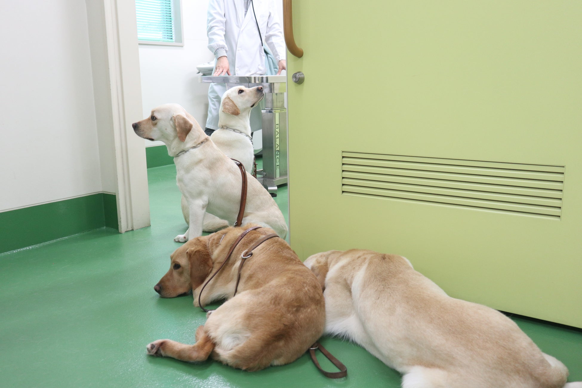 定期的な健診(体重測定、血液検査、目や耳、股関節などのチェック)としては、飼育ボランティア家庭から協会に戻ってきた時、視覚障害者との歩行指導が始まる前、歩行指導の終盤などの決まったタイミングがあります。犬の健康上何か気になることがあればいつでも獣医師への相談や診察を依頼できる体制を整えています。