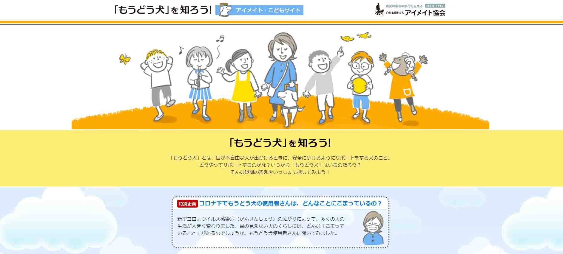 2020年7月に開設した人気のウェブサイト「もうどう犬」を知ろう! ~アイメイト・こどもサイト(https://www.eyemate.org/kids/)は、ご家庭や教育現場で楽しみながら、アイメイト(盲導犬)に関する正しい知識を学習できるよう制作したものです。さらに、アイメイト(盲導犬)に関する内容だけでなく、アイメイト使用者や視覚障害者が感じる「不便さ」や「不自由さ」についても紹介しています。大人と一緒に深く考えることで、子どもたちに思いやりのあるやさしい心が育まれることを願っています。(対象年齢:小学校5年生以上)